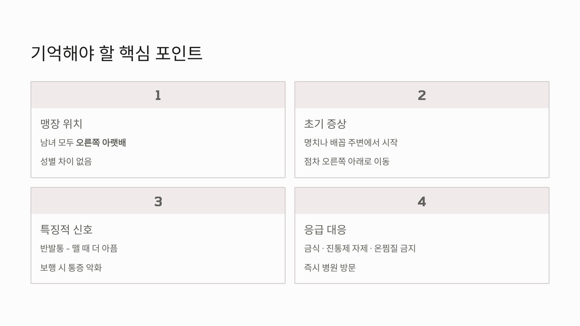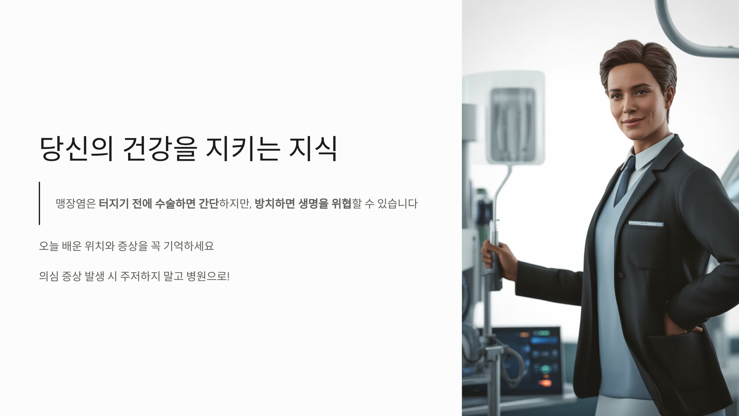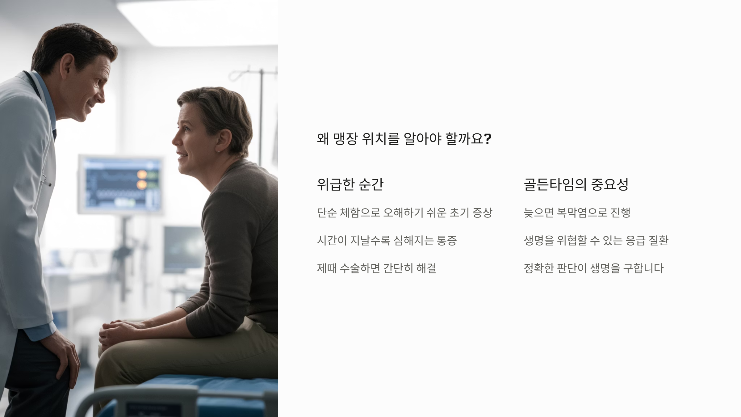 특히 "남자는 오른쪽, 여자는 왼쪽"이라는 잘못된 속설 때문에 엉뚱한 곳을 짚으며 안심하다가, 염증이 터져 복막염으로 진행되는 위험한 상황도 종종 발생합니다.