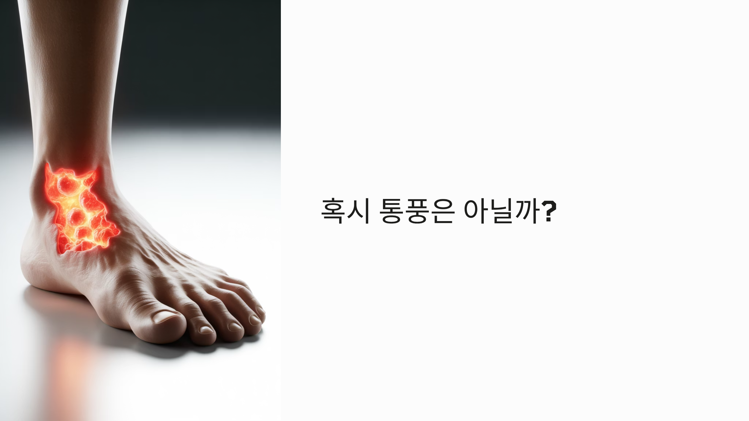 - 통풍의 특징: 통풍은 체내 요산 수치가 높아져 관절에 요산 결정이 쌓여 발생합니다. 주로 엄지발가락에서 시작되지만 발목이나 발뒤꿈치에도 올 수 있습니다. 통풍은 예고 없이 갑작스럽게 극심한 통증이 오며, 환부가 벌겋게 부어오르고 뜨거운 열감이 느껴지는 것이 특징입니다. 스치기만 해도 자지러질 듯한 통증이 동반됩니다.