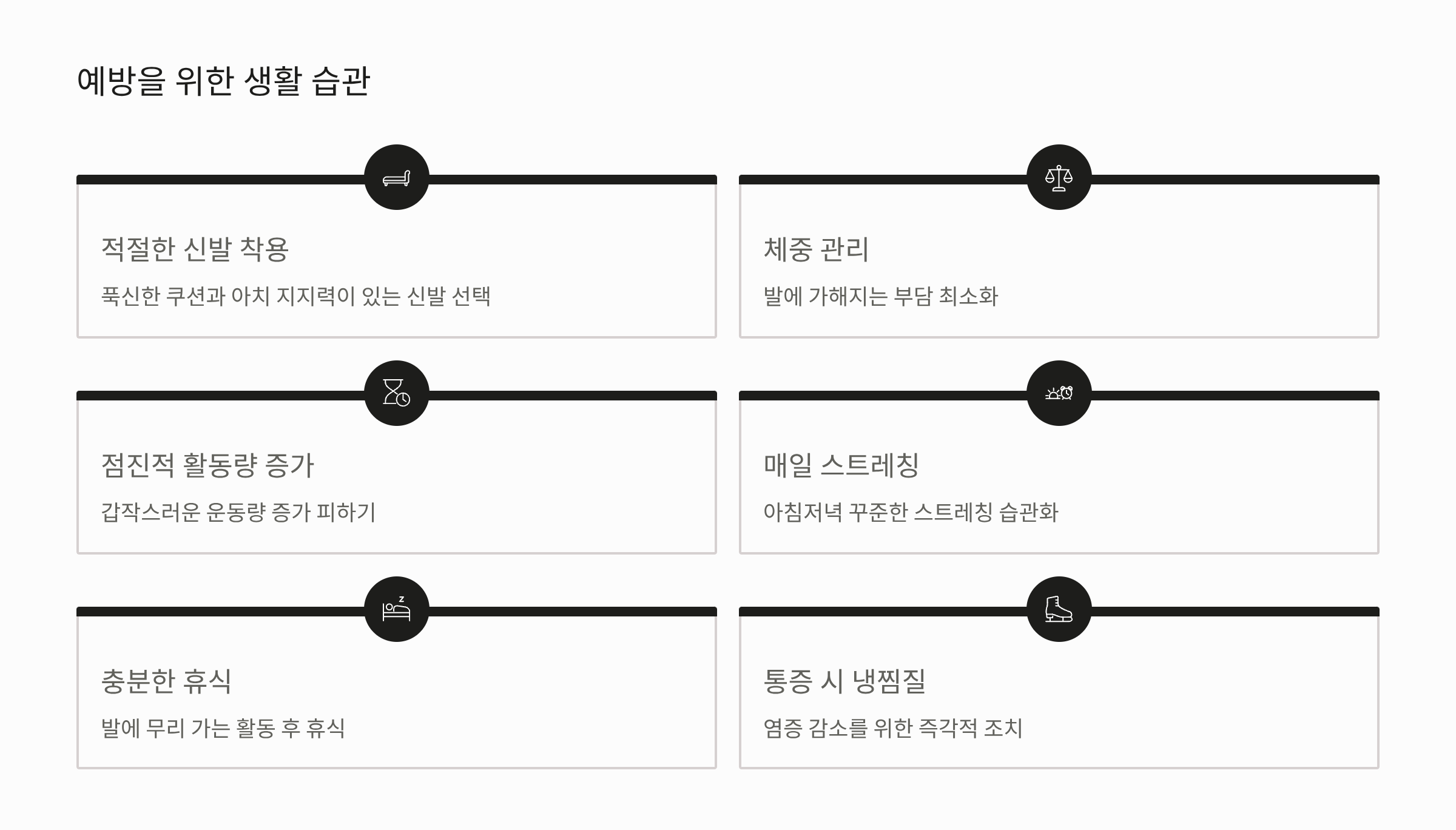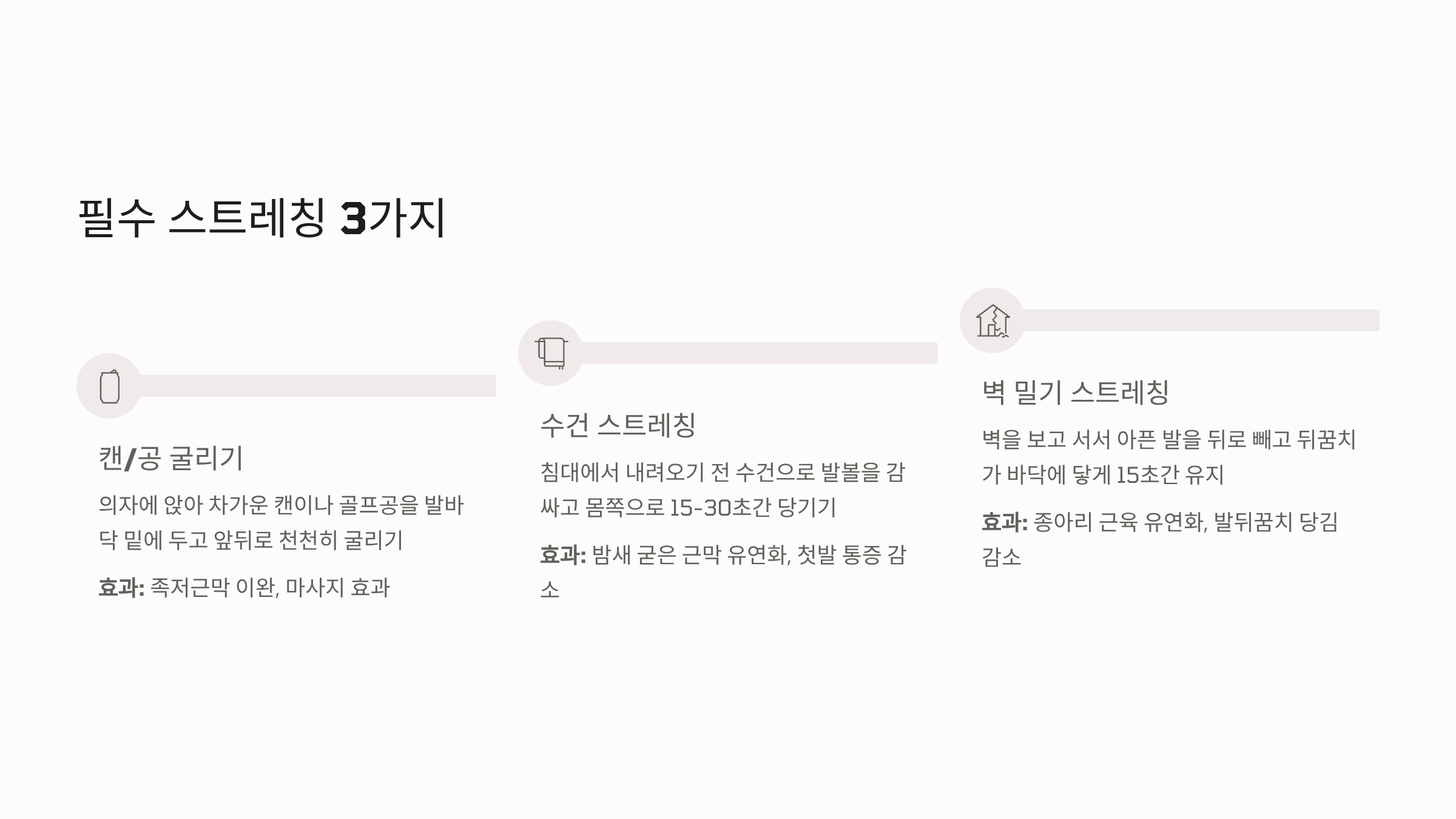 발뒤꿈치 통증 치료의 90%는 스트레칭에 달려 있다고 해도 과언이 아닙니다. 족저근막과 종아리 근육(아킬레스건)을 늘려주는 스트레칭을 습관화해야 합니다.