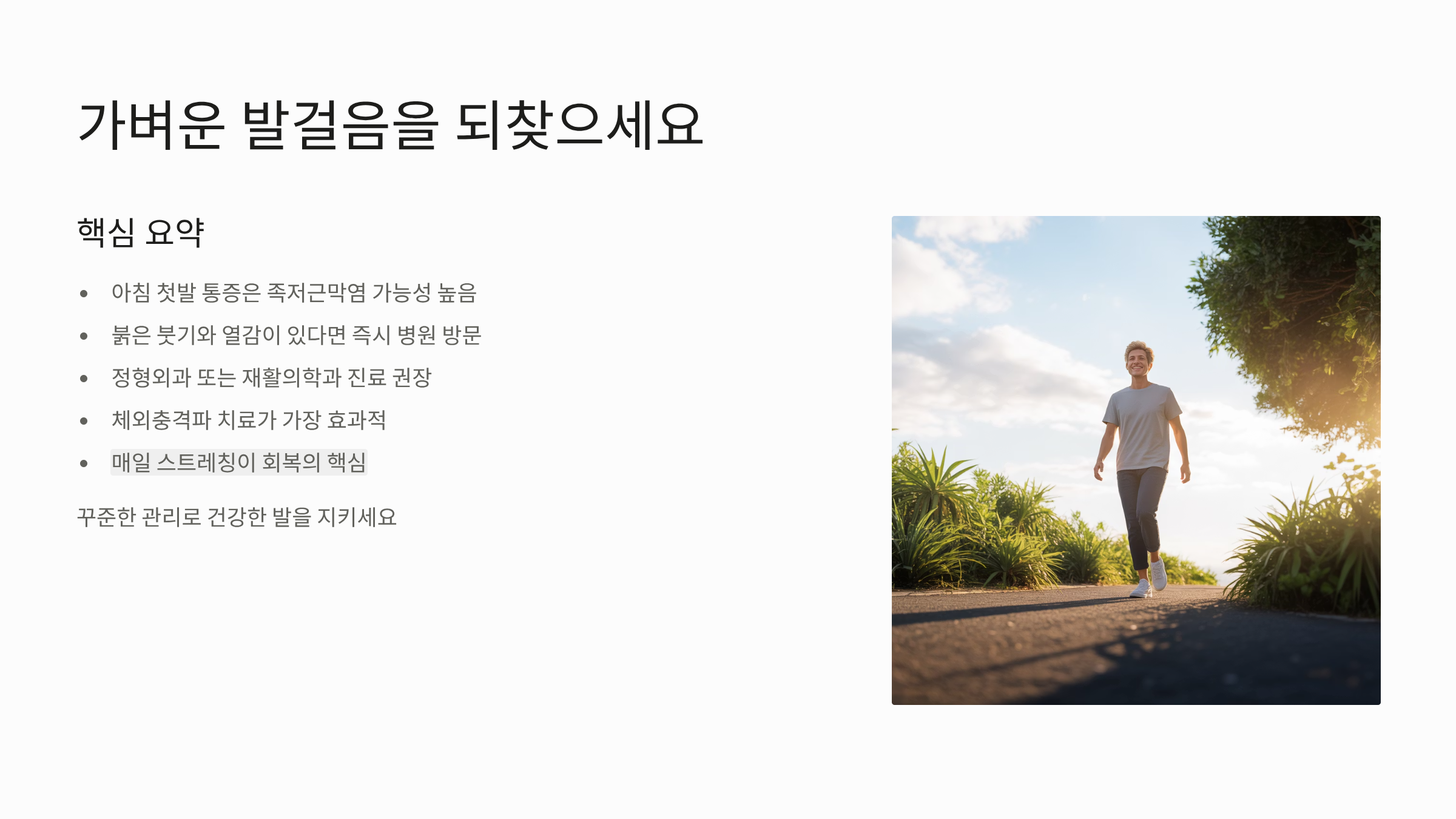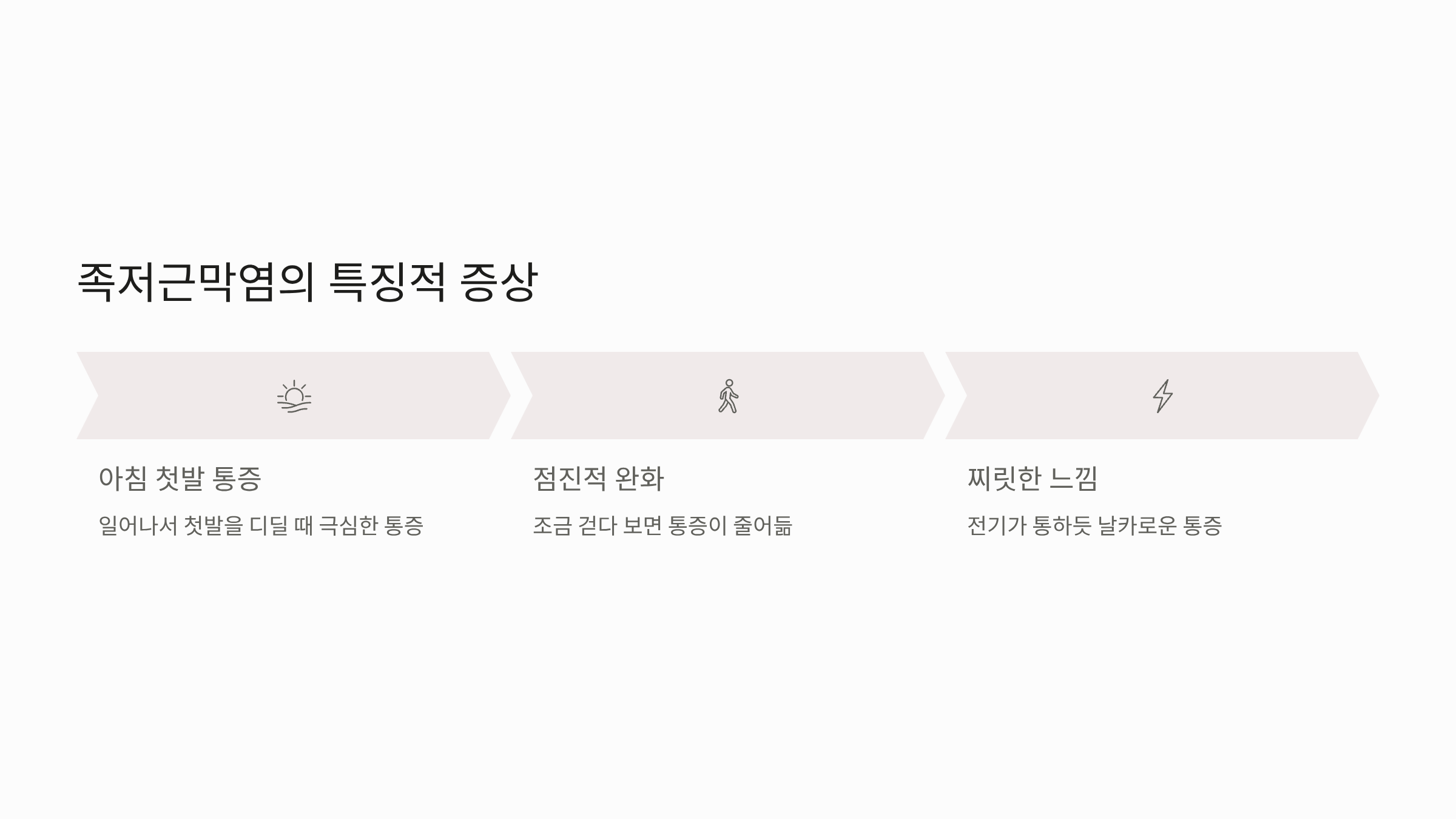 - 족저근막염: 과도한 운동, 급격한 체중 증가, 노화, 혹은 굽이 낮거나 딱딱한 신발 착용 등으로 족저근막에 반복적인 미세 손상이 가해지면 염증이 발생합니다. 특징적인 증상은 아침에 일어나 첫발을 디딜 때 심한 통증이 느껴지고, 조금 걷다 보면 통증이 줄어드는 것입니다.