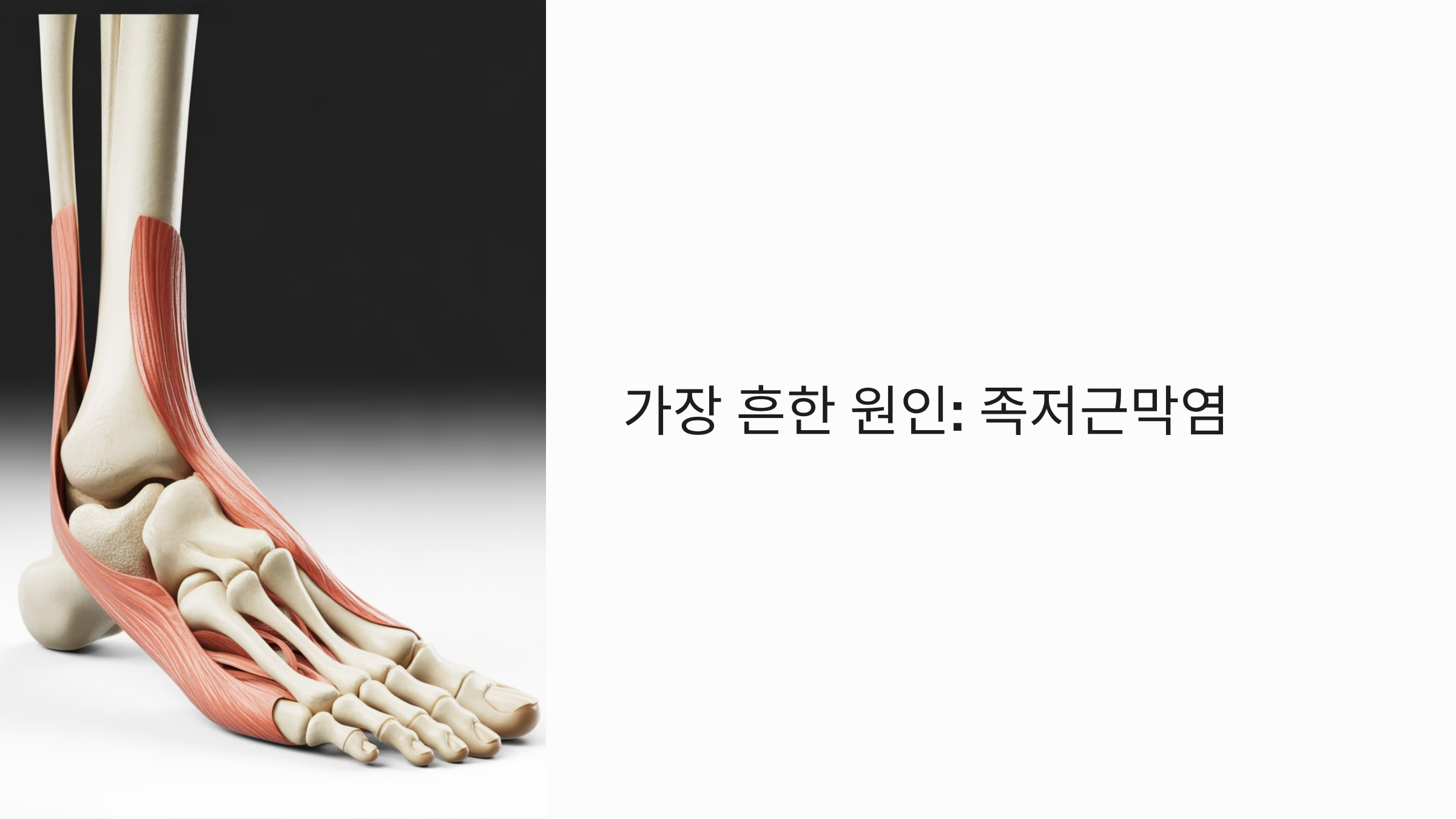 발뒤꿈치가 아픈 이유는 다양하지만, 가장 대표적이고 흔한 원인은 족저근막염입니다. 족저근막은 발뒤꿈치 뼈에서 시작해 발가락 기저 부위까지 이어지는 두껍고 강한 섬유 띠로, 발의 아치를 유지하고 충격을 흡수하는 역할을 합니다.