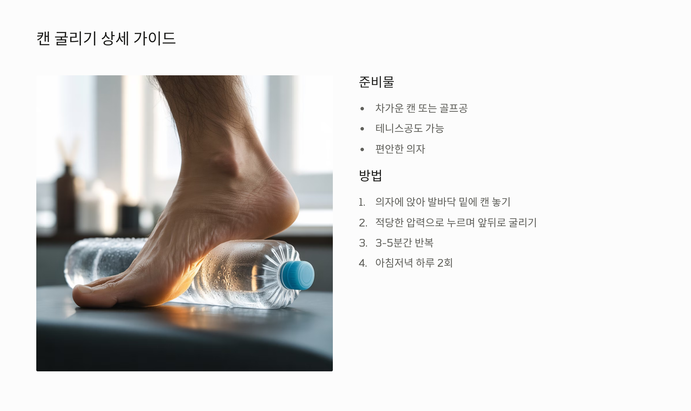 - 캔/공 굴리기: 의자에 앉아 차가운 캔이나 골프공, 테니스공을 발바닥 밑에 둡니다. 발바닥으로 공을 누르며 앞뒤로 천천히 굴려 마사지합니다. 족저근막을 이완시키는 데 매우 효과적입니다.