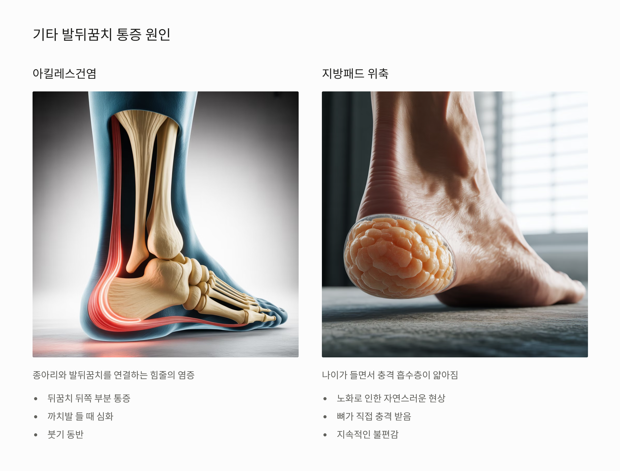 - 지방패드 위축: 나이가 들면서 발뒤꿈치의 충격을 흡수해 주는 지방층이 얇아져 뼈가 직접적인 충격을 받아 통증이 생길 수 있습니다.