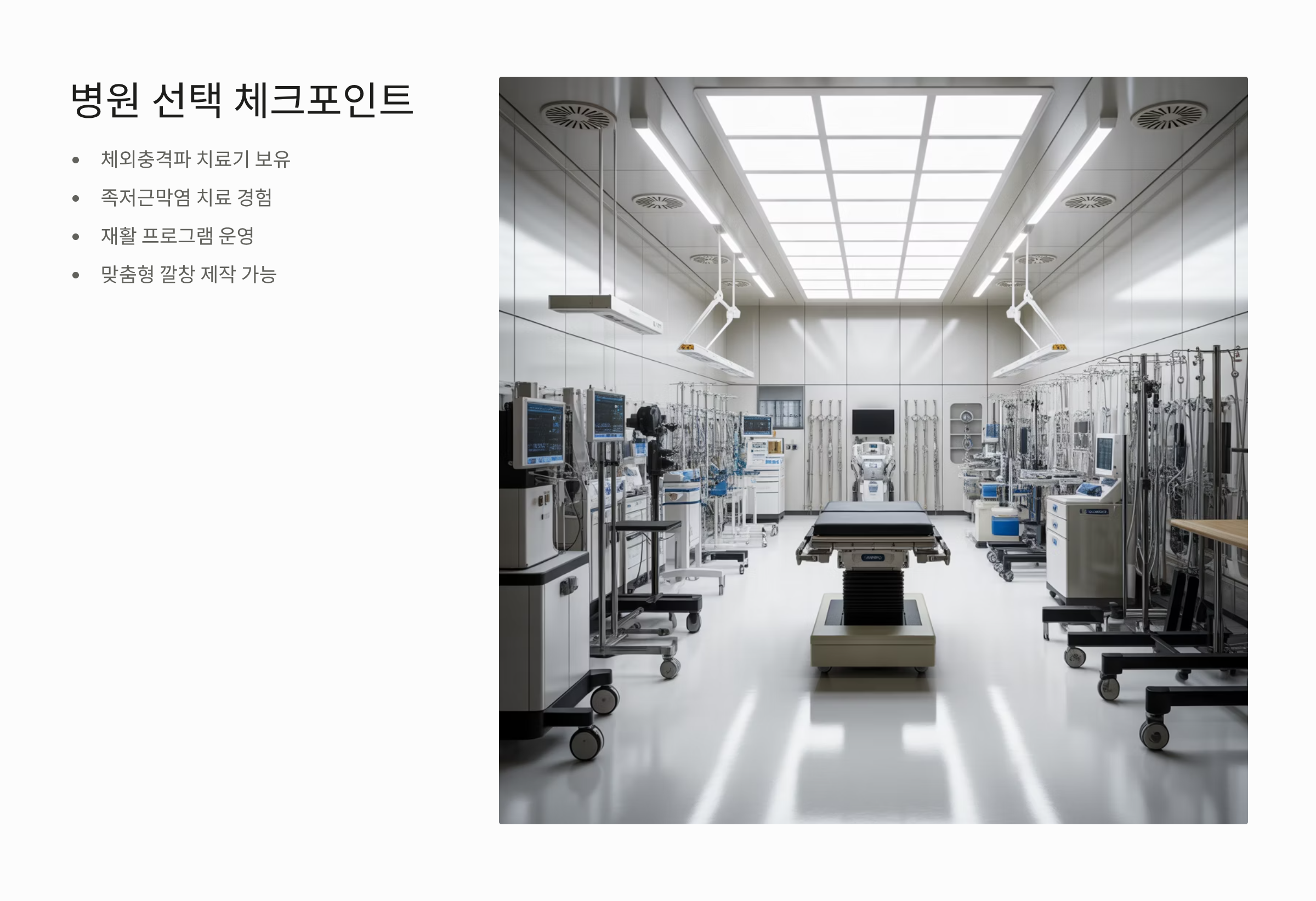 병원을 선택할 때는 체외충격파 치료기 등 족저근막염 치료를 위한 장비가 제대로 갖춰져 있는지 확인하는 것이 좋습니다.