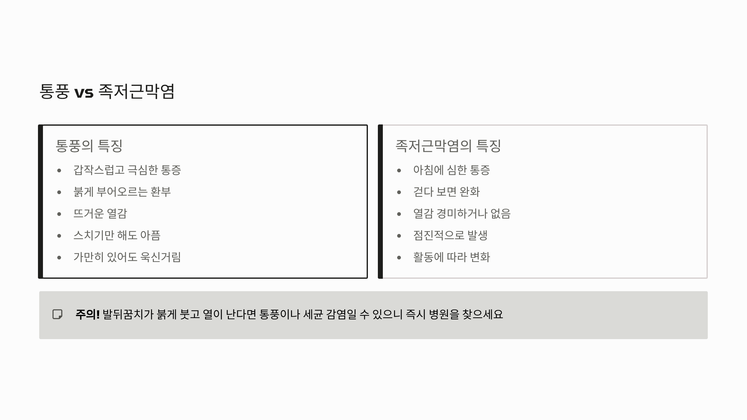 - 구별 포인트: 족저근막염은 걷다 보면 통증이 약간 줄어드는 경향이 있고 열감이 심하지 않은 반면, 통풍은 가만히 있어도 욱신거리고 붓기와 열감이 뚜렷합니다. 만약 발뒤꿈치가 붉게 붓고 열이 난다면 통풍이나 세균 감염일 수 있으니 즉시 병원을 찾아야 합니다.