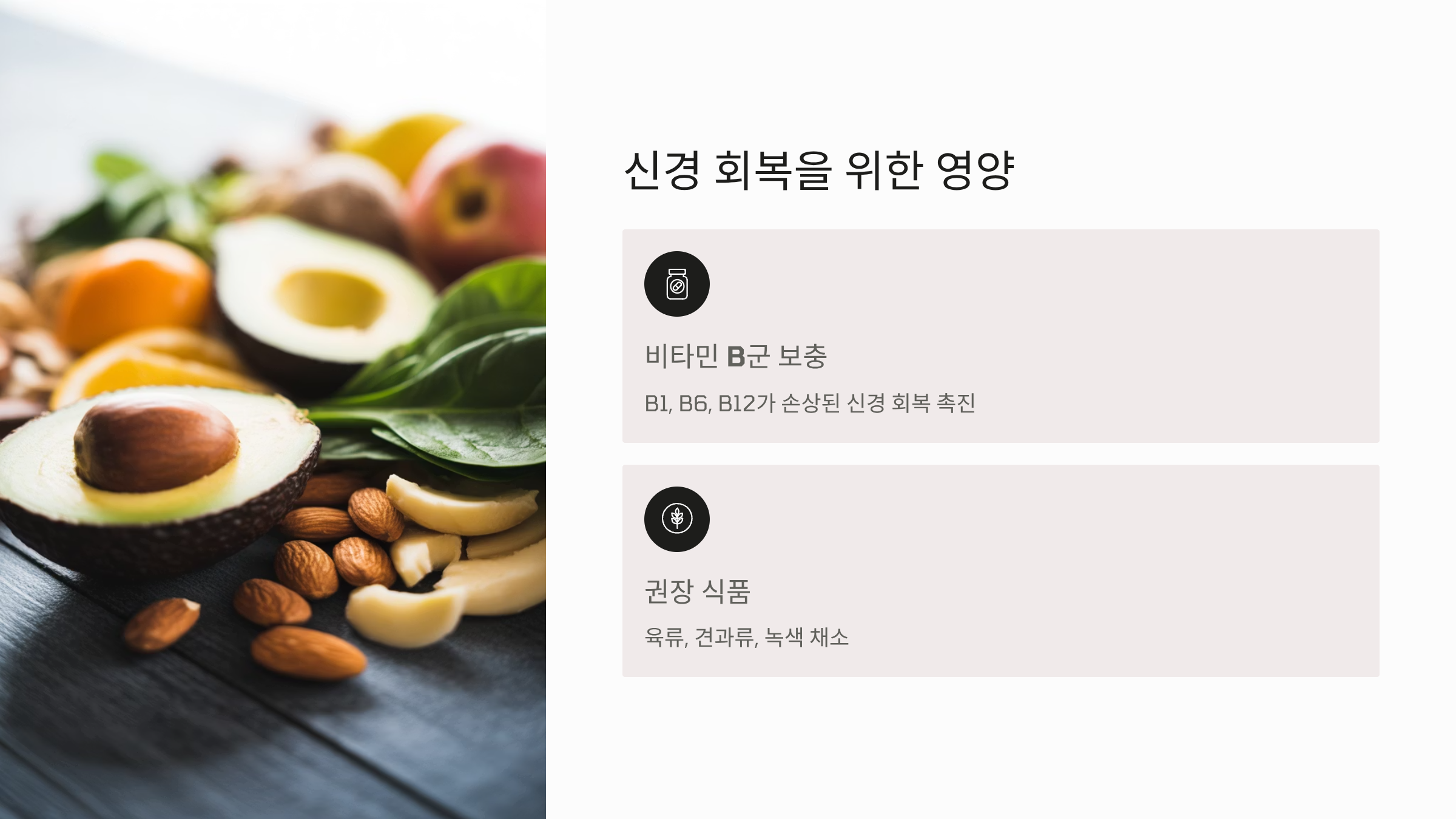 - 비타민 B군 보충: 신경병증이 의심될 경우, 비타민 B군(특히 B1, B6, B12)이 부족하지 않도록 영양제를 복용하거나 관련 식품(육류, 견과류, 녹색 채소)을 섭취하여 손상된 신경 회복을 돕습니다.