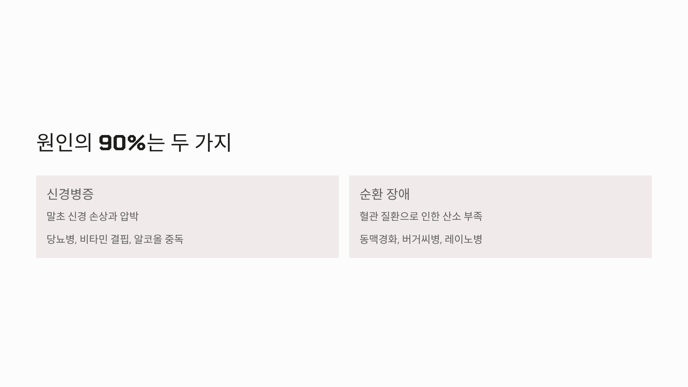 - 주요 질환: 당뇨병성 신경병증이 가장 흔하며, 비타민 B군 결핍, 만성 알코올 중독, 신장 질환 등도 원인이 될 수 있습니다.