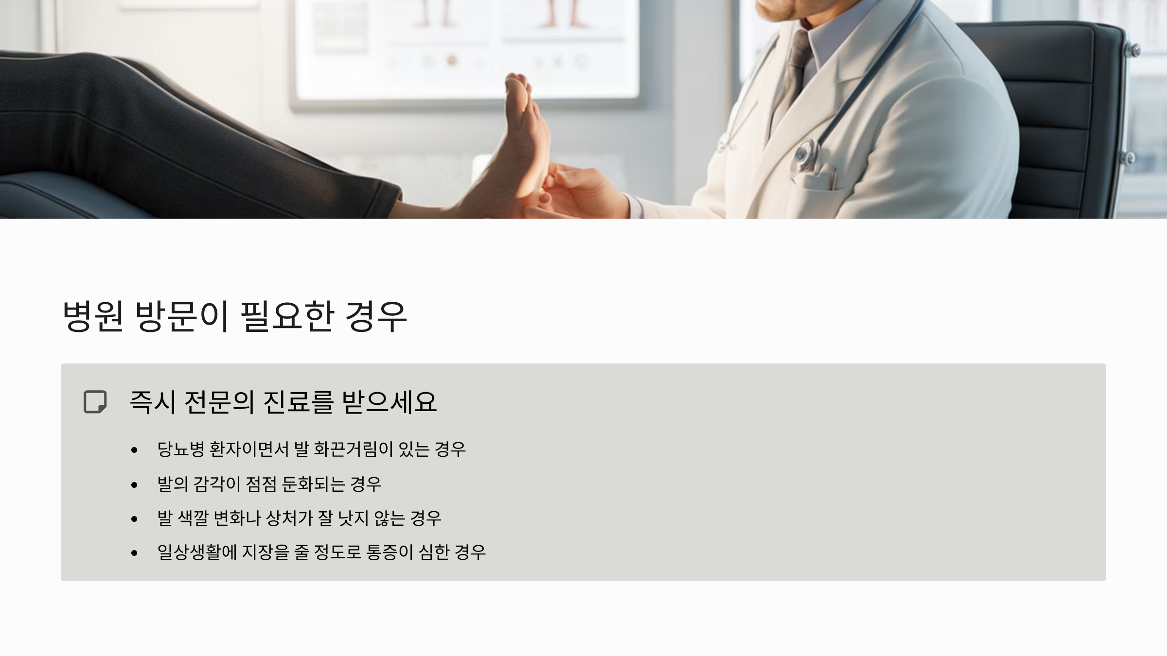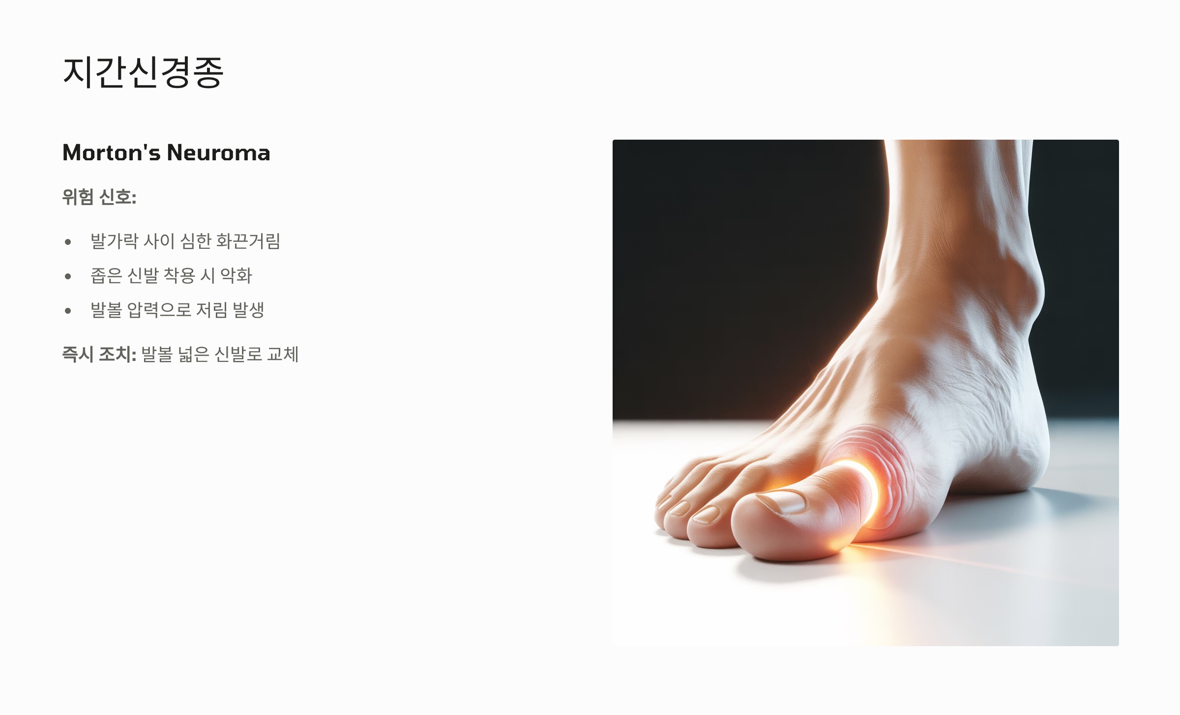 - 위험 신호: 좁은 신발을 신거나 발볼에 압력이 가해질 때 발가락 사이가 심하게 화끈거리거나 저리는 통증이 발생합니다.