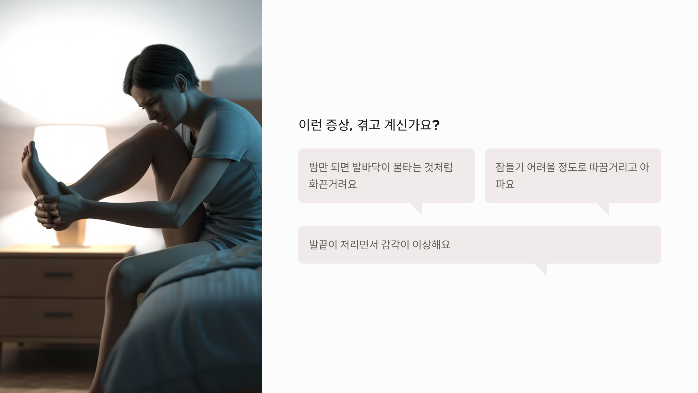 - 원인: 대부분 말초 신경병증(당뇨병성)이나 지간신경종 때문입니다. 발가락 끝이나 발가락 사이(특히 3, 4번째)에서 화끈거림이 심하게 느껴집니다.