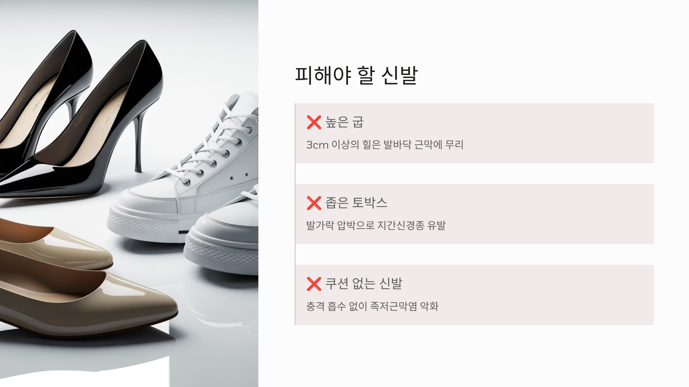 - 굽 높이: 굽이 너무 높거나(3cm 이상) 너무 낮은 신발(플랫슈즈)은 발바닥 근막에 무리를 주므로 피해야 합니다.