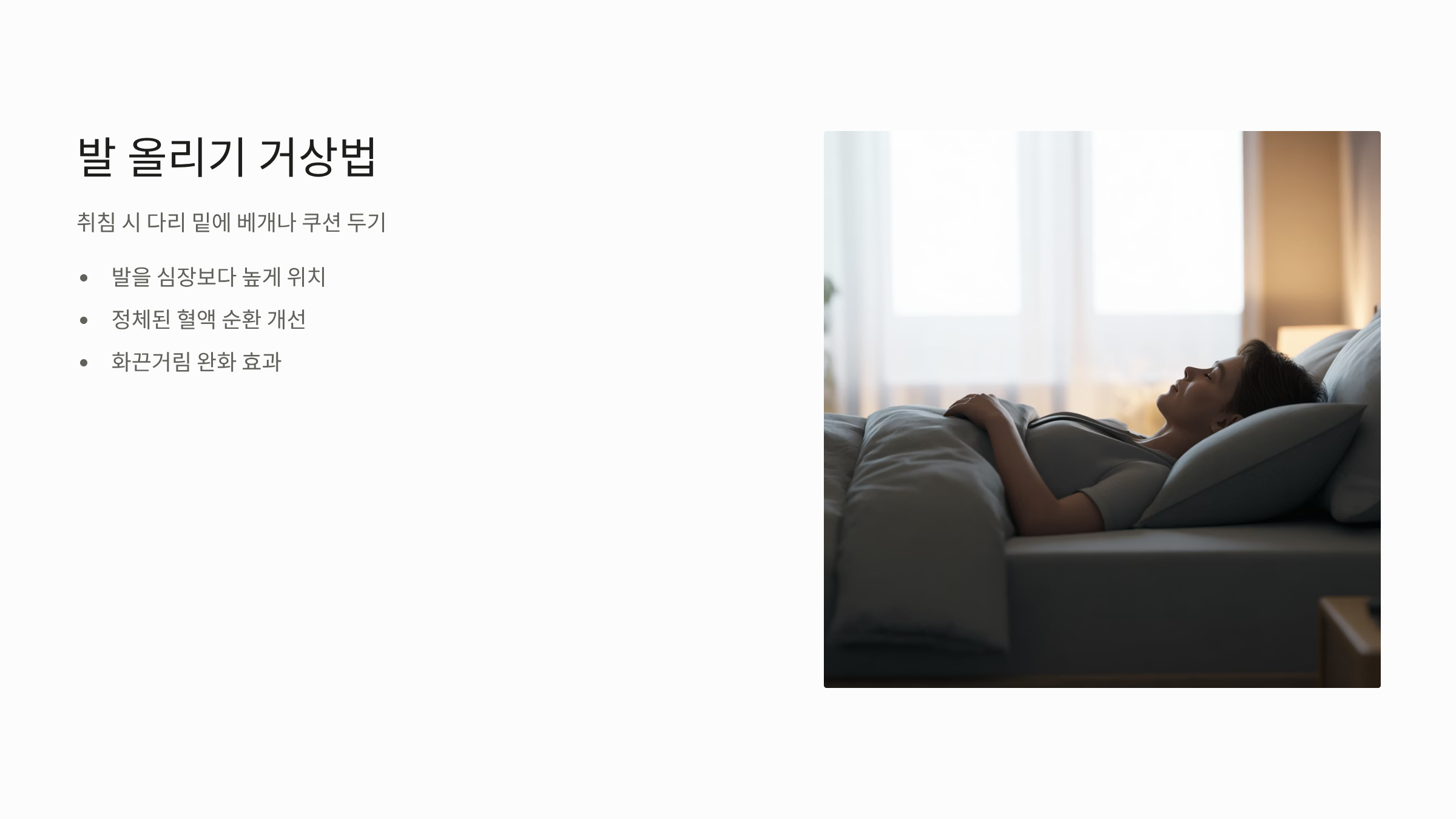 - 발 올리기 (거상): 취침 시 다리 밑에 베개나 쿠션을 두어 발을 심장보다 높게 두면, 정체된 혈액이 심장으로 잘 돌아가 혈액 순환 장애로 인한 화끈거림 완화에 도움을 줍니다.