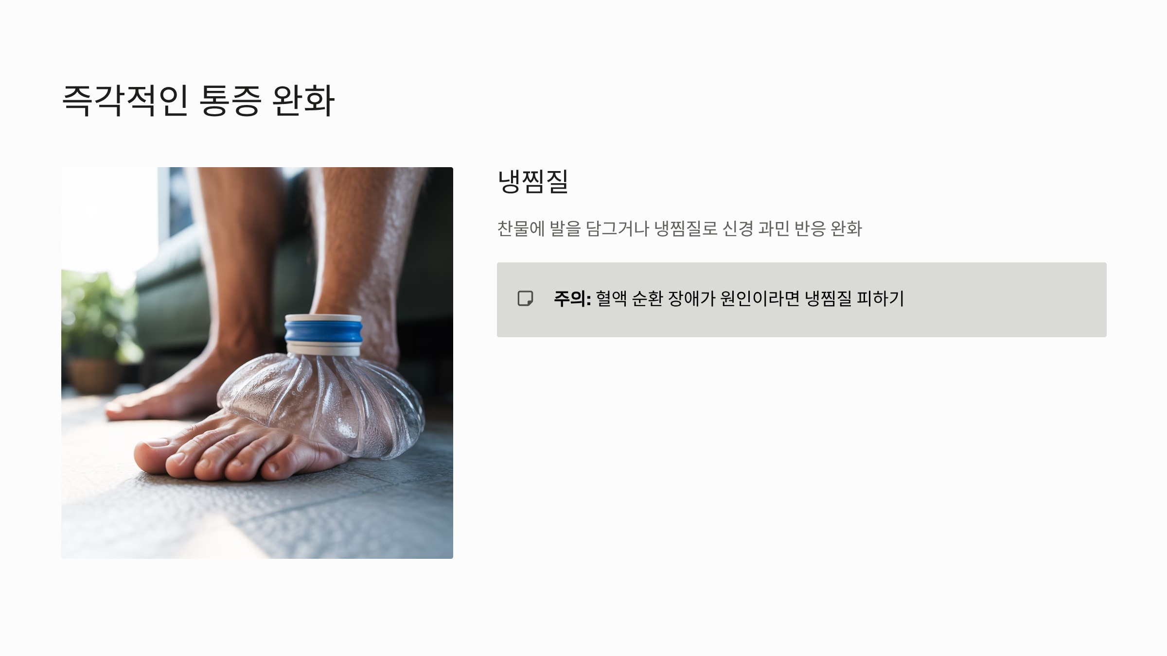 - 냉찜질 (신경통증 완화): 화끈거림은 염증이나 신경의 과민 반응 때문이므로, 발을 찬물에 담그거나 냉찜질을 하면 일시적으로 신경을 마비시켜 통증을 빠르게 완화할 수 있습니다. (단, 순환 장애가 원인일 경우 냉찜질은 오히려 피해야 합니다.)