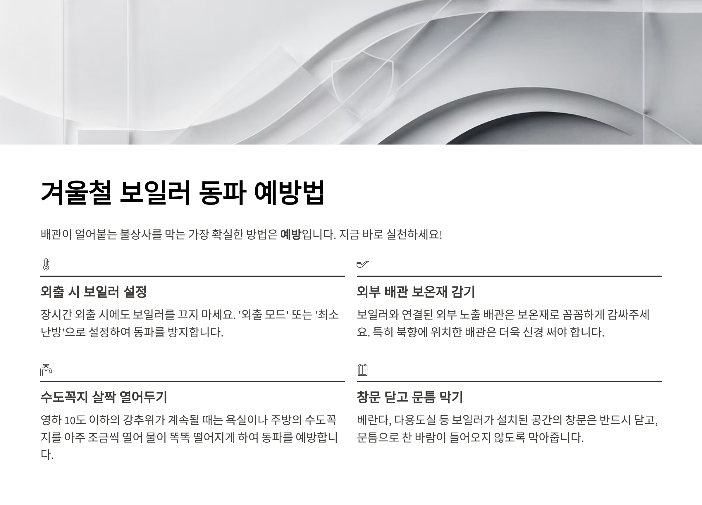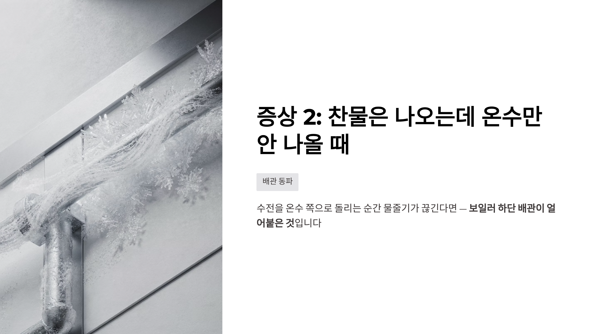 영하로 기온이 뚝 떨어진 겨울 아침, 샤워기를 틀었는데 찬물만 계속 나오고 온수가 나오지 않으면 그야말로 패닉에 빠지게 됩니다.