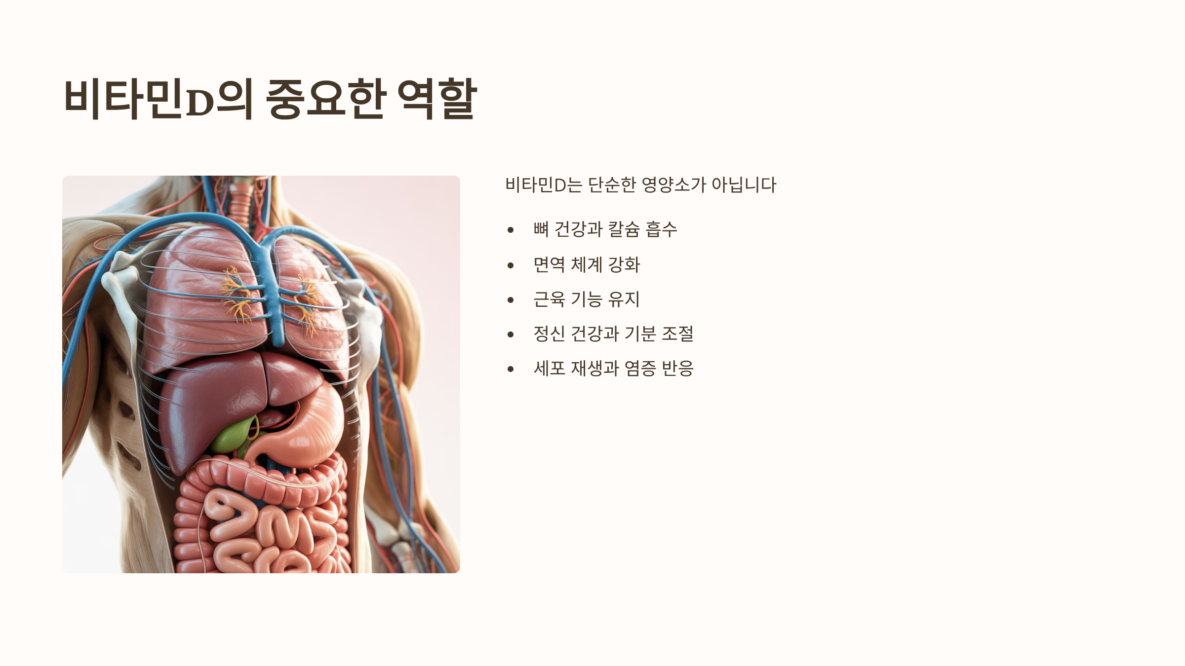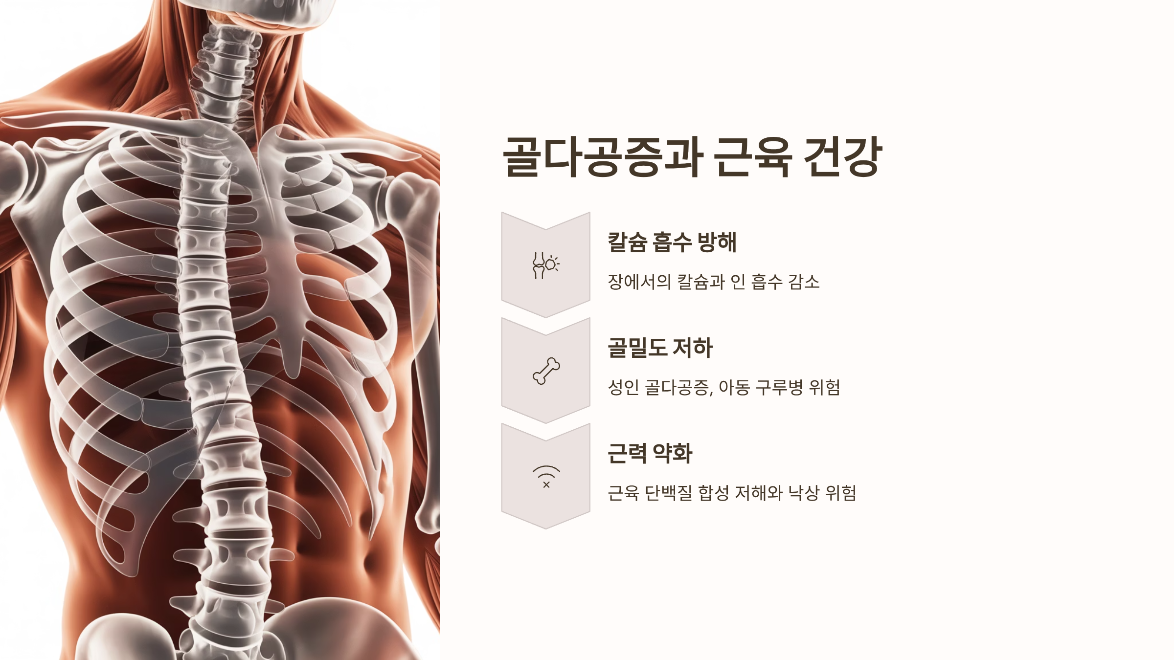 - 해결책: 뼈 건강 관리를 위해서는 칼슘 영양제 복용 시 비타민D를 반드시 함께 섭취해야 하며, 비타민D가 체내 흡수된 칼슘을 뼈로 운반하는 데 도움을 줍니다.