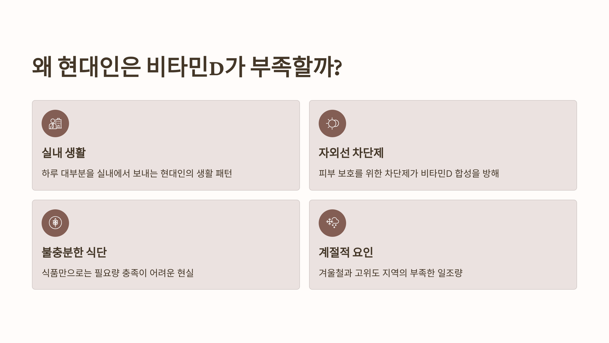 비타민D는 다른 비타민과 달리 음식 섭취만으로는 충분량을 채우기 어렵습니다. 현대인이 비타민D 부족에 취약한 이유를 분석합니다.