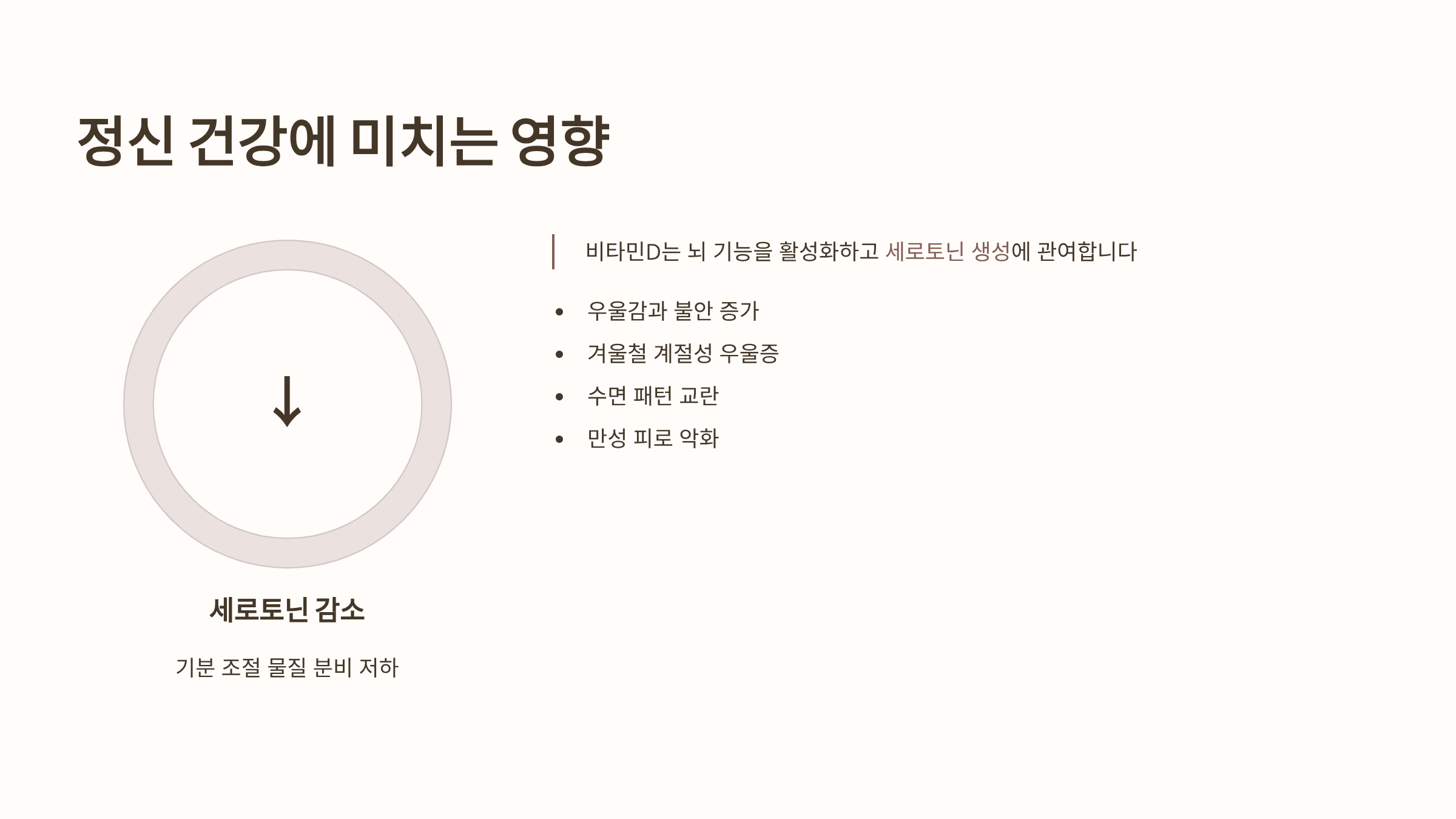 - 세로토닌 분비 조절: 비타민D는 뇌 기능을 활성화시키고, 기분을 조절하는 신경전달물질인 세로토닌의 생성 및 분비에 관여합니다. 비타민D 수치가 낮으면 세로토닌 분비가 줄어들어 우울감, 불안, 짜증이 쉽게 유발될 수 있습니다.