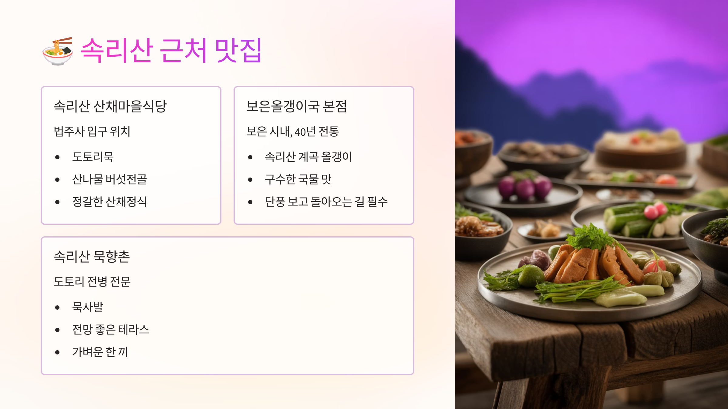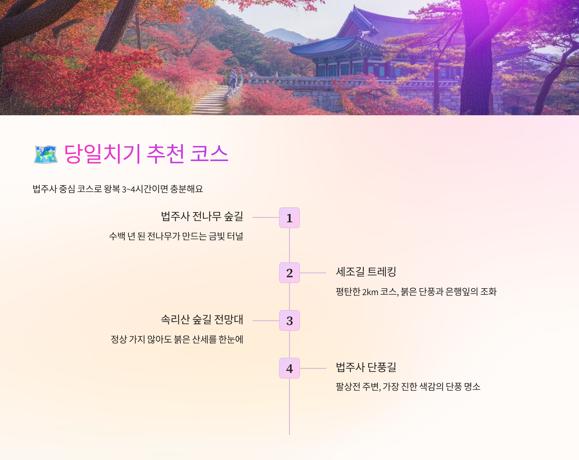 지금부터 왜 이 시기에 속리산 단풍을 꼭 봐야 하는지, 교통편부터 당일치기 코스, 주변 맛집, 그리고 법주사 단풍길의 매력까지 자세히 알려드릴게요.