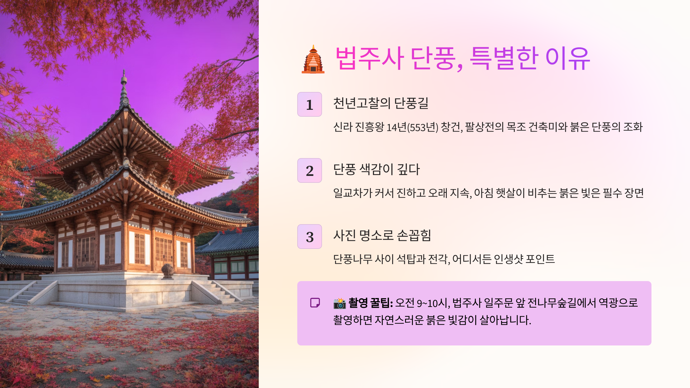 - 특히 아침 햇살이 법주사 단풍길을 비출 때의 붉은 빛은 꼭 직접 봐야 할 장면입니다.