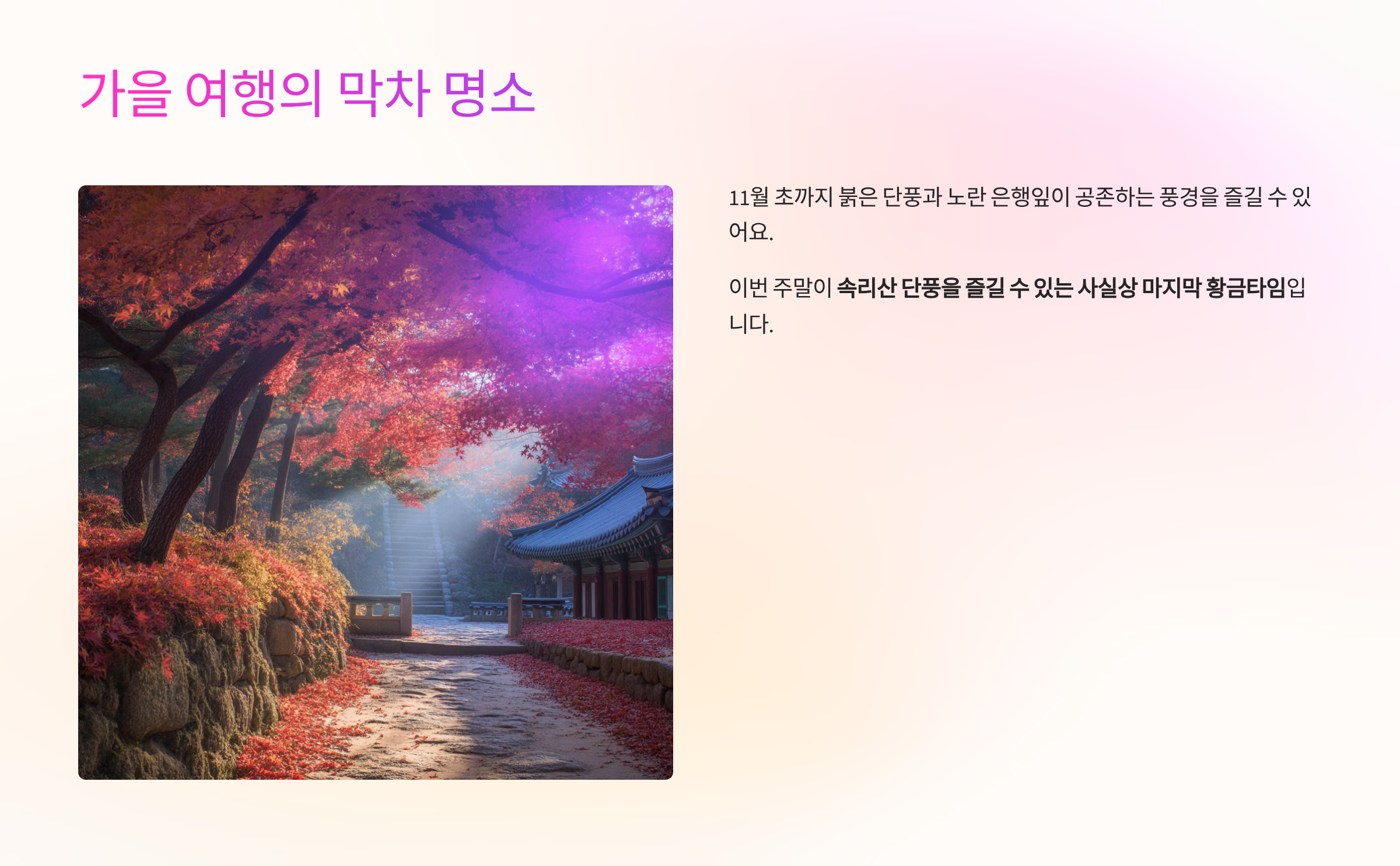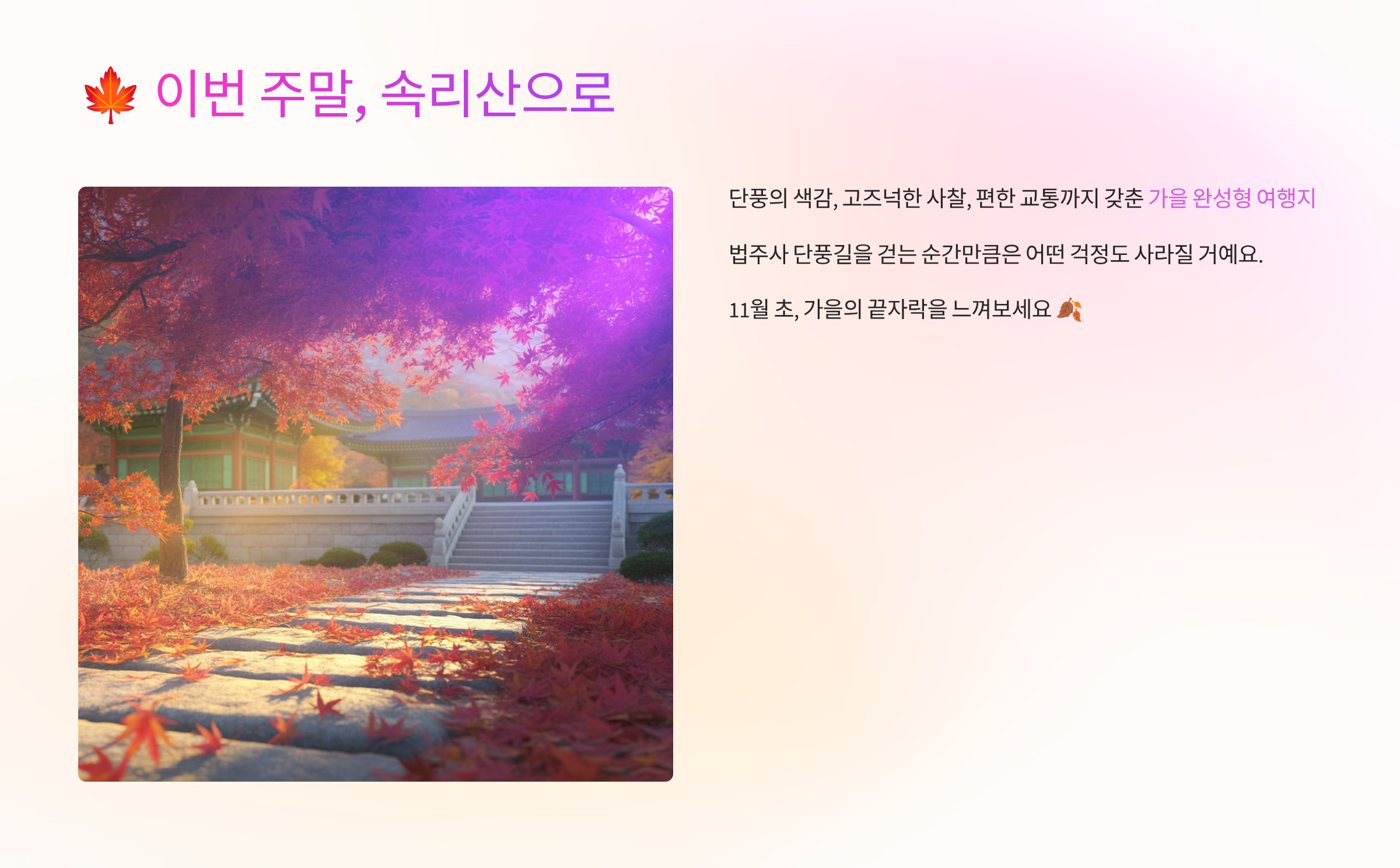 11월 초까지 이어지는 절정의 단풍을 놓치지 말고, 이번 주말엔 속리산으로 가을의 끝자락을 느껴보세요.