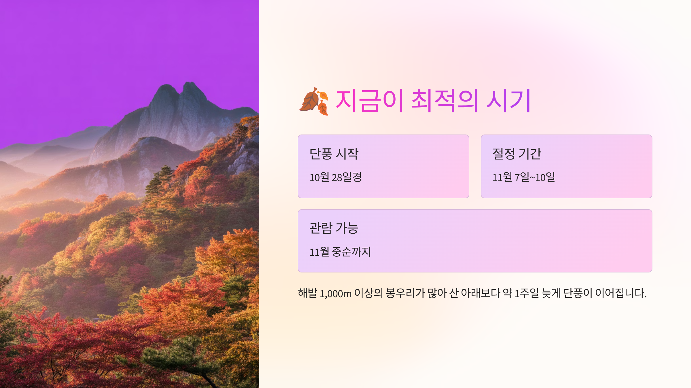 가을의 절정을 알리는 설악산 단풍, 언제가 가장 아름다울까요?이번 글에서는 2025년 설악산 단풍 절정시기와 함께 교통, 주차, 케이블카 이용법, 포토스팟, 숙소, 맛집, 트레킹 코스 등 모든 정보
