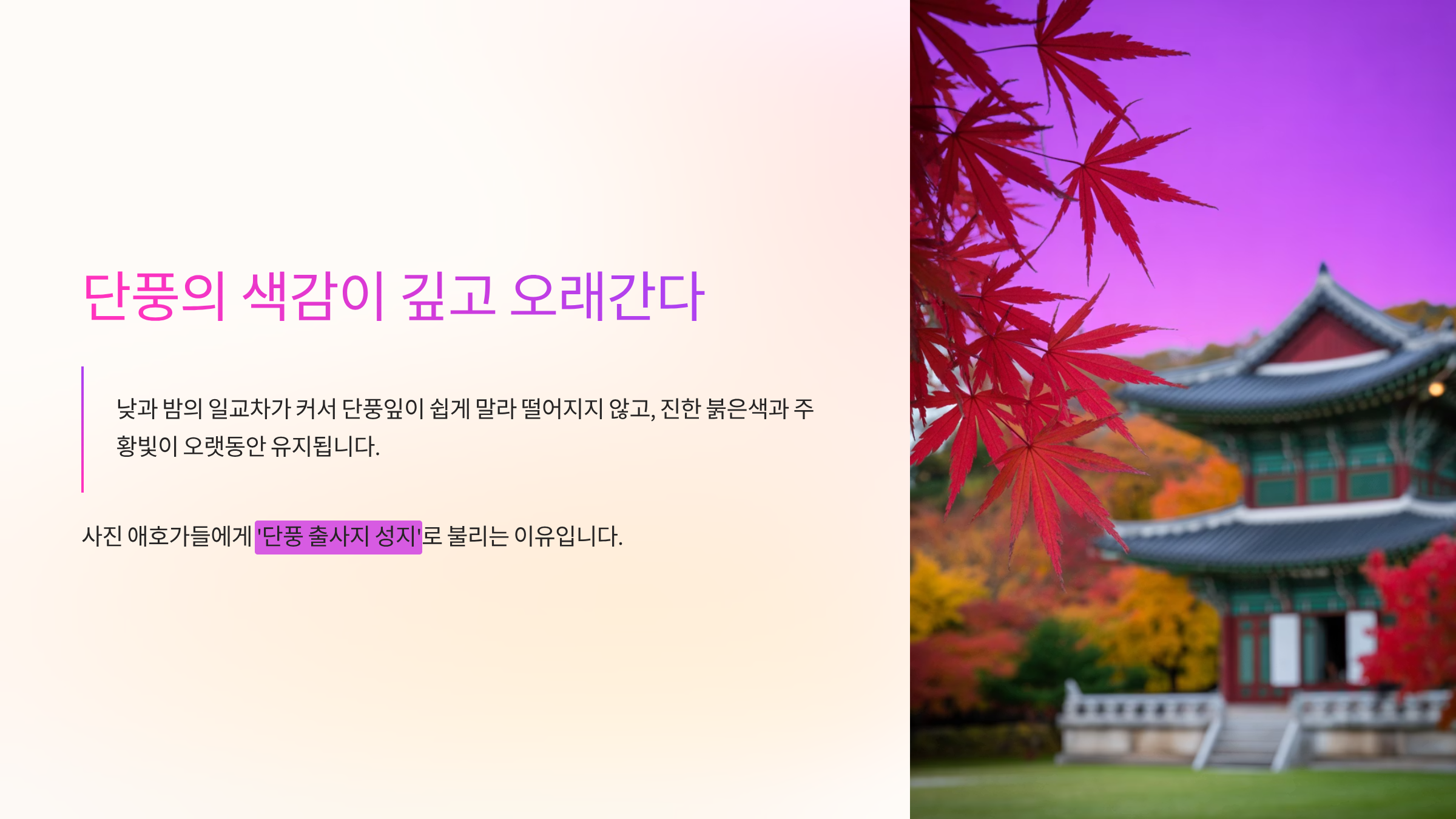 낮과 밤의 일교차가 커서 단풍잎이 쉽게 말라 떨어지지 않고, 진한 붉은색과 주황빛이 오랫동안 유지됩니다.