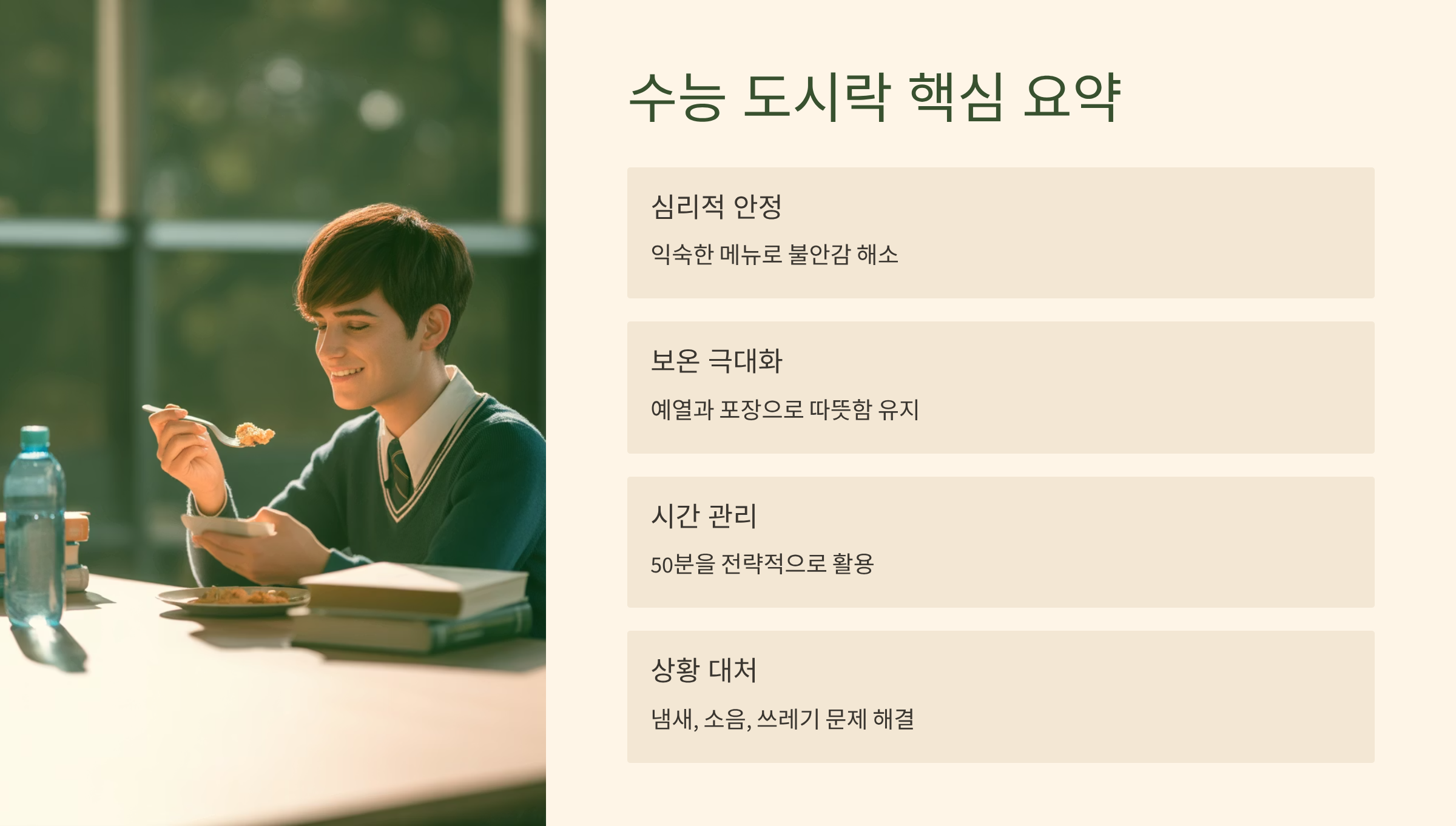 - 부모님의 심리적 부담 완화: 부모님은 도시락 준비 대신, 수험생에게 격려를 해주고 컨디션을 챙기는 데 집중할 수 있습니다.