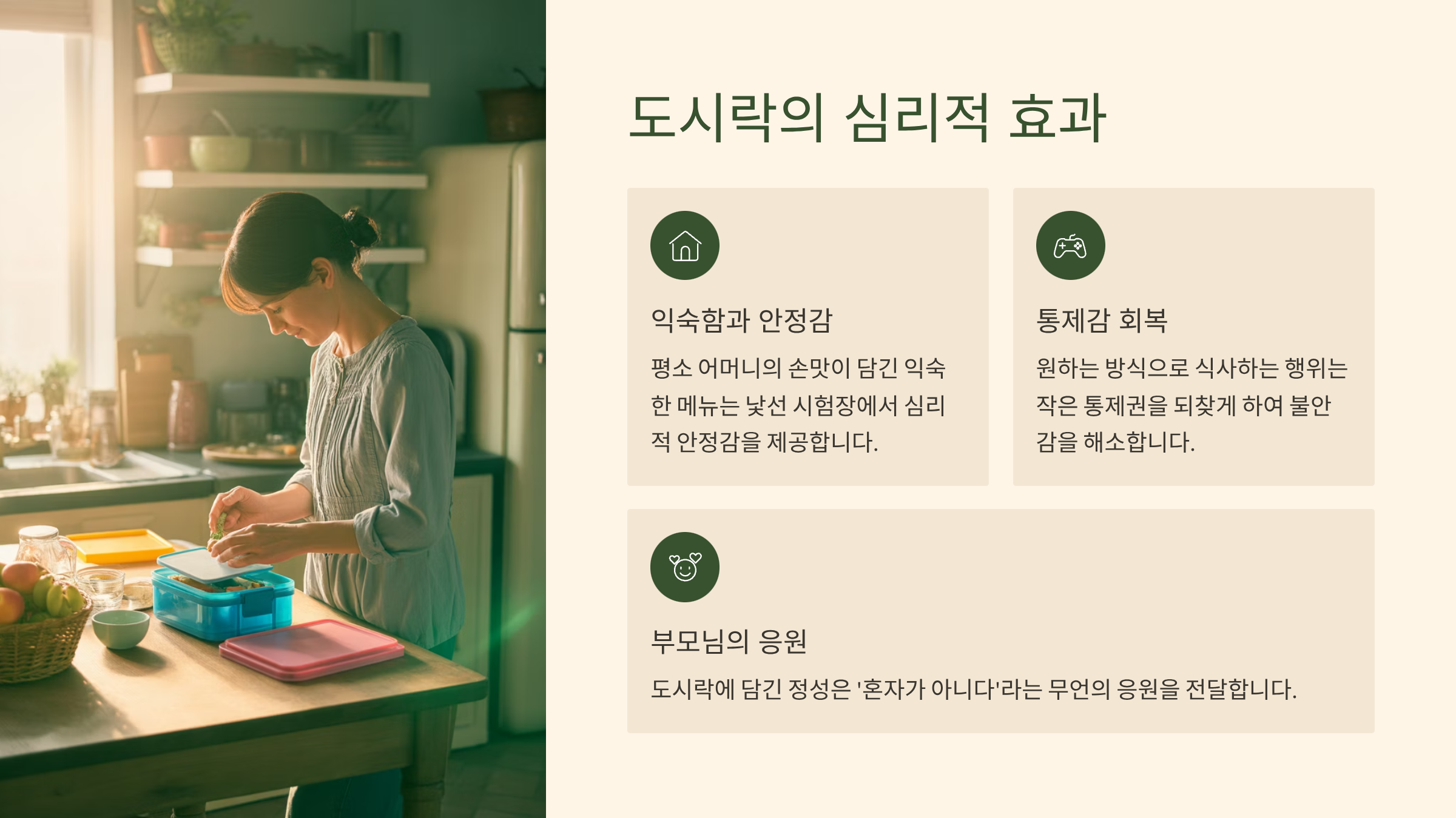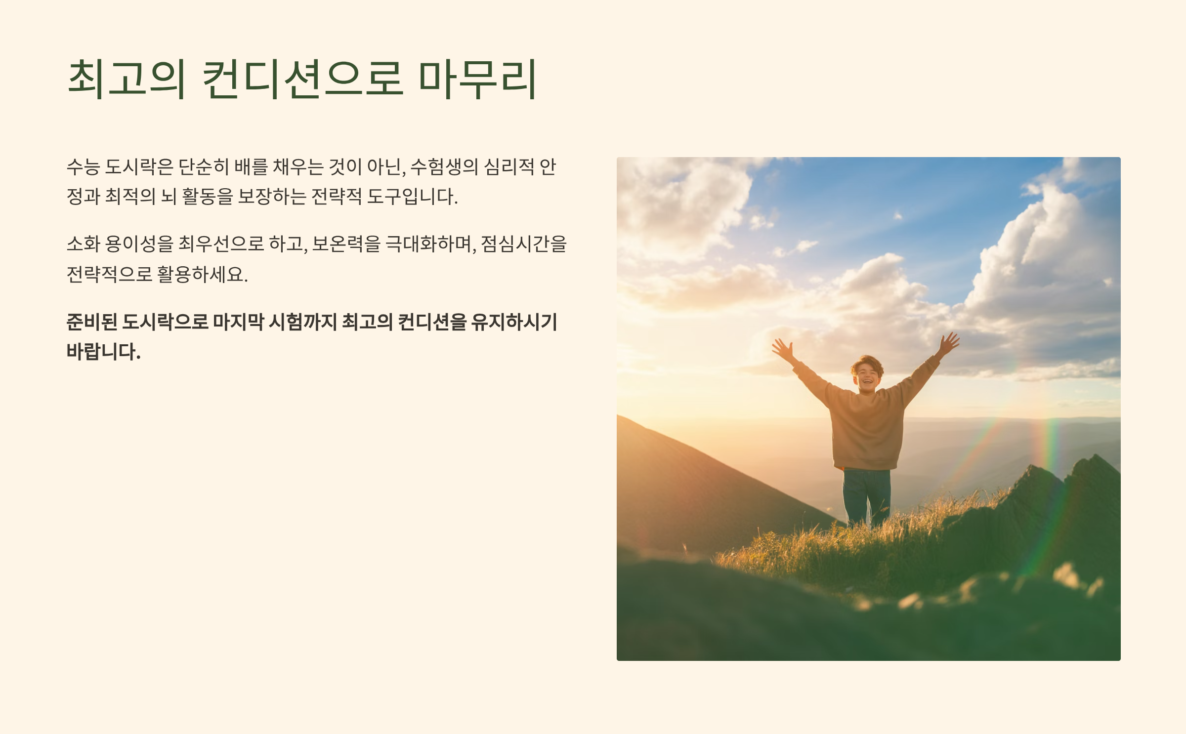 - 통제감 회복: 수능 시험은 수험생이 통제할 수 없는 외부 요소(문제 난이도, 주변 환경)가 많습니다. 점심 도시락을 자신이 원하는 방식으로, 원하는 메뉴로 먹는 행위는 작은 통제권을 되찾는 느낌을 주어 불안감을 해소하고 다음 시험에 집중할 수 있는 힘을 줍니다.