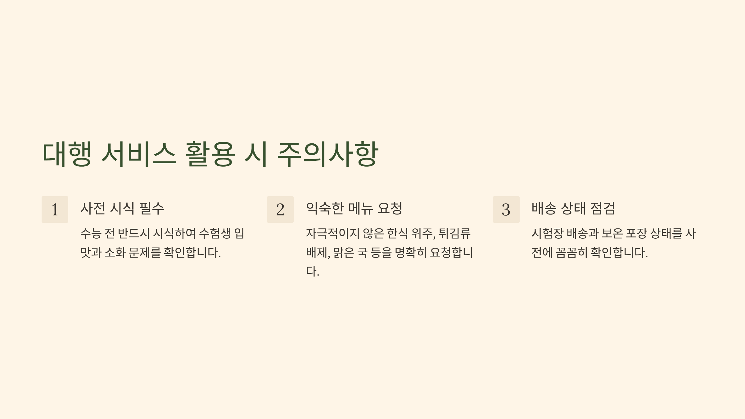 - 메뉴의 익숙함 요청: 주문 시 '자극적이지 않은 한식 위주, 튀김류 배제, 맑은 국' 등 수험생에게 익숙한 메뉴와 조리법을 요청해야 합니다. 새로운 맛은 수능 당일에 변수가 될 수 있습니다.