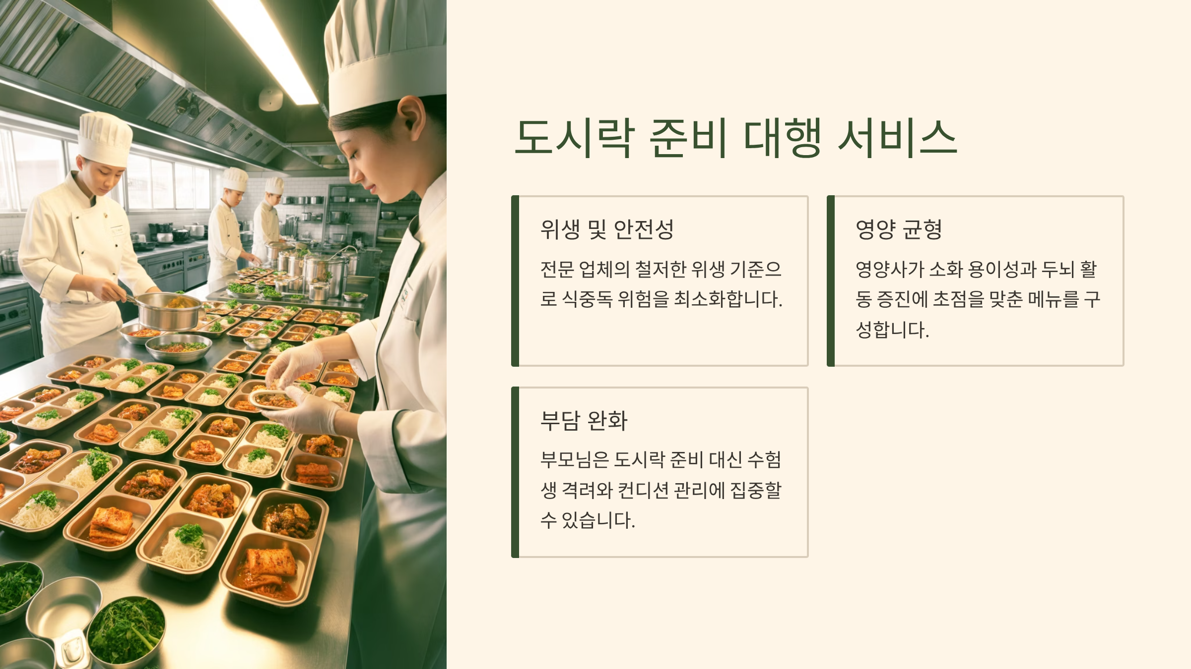 수능 당일 부모님의 심적 부담은 매우 큽니다. 이 부담을 덜고 위생과 전문성까지 확보할 수 있는 도시락 준비 대행 서비스(케이터링)를 활용하는 것도 현명한 대안이 될 수 있습니다.