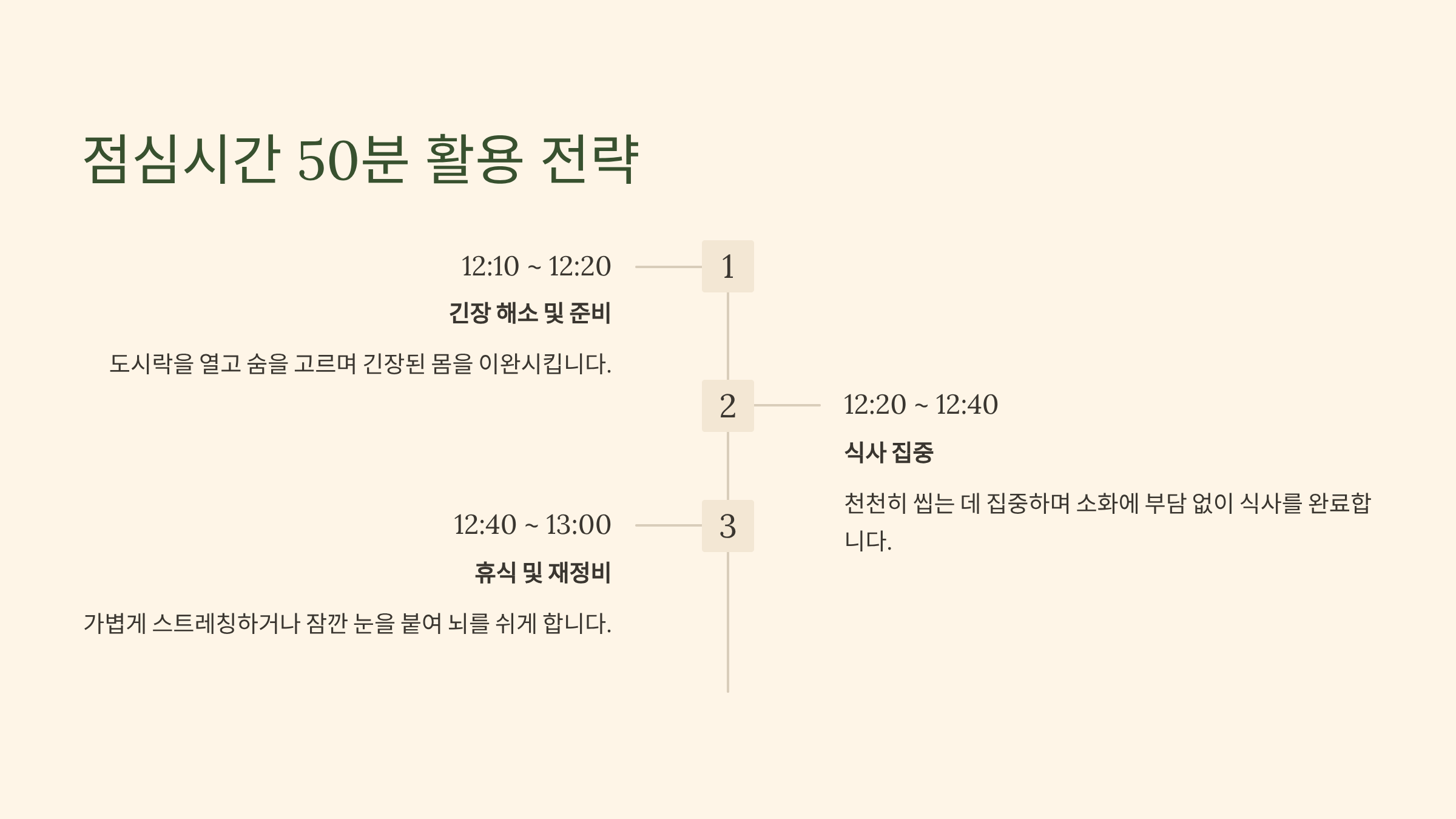 - 12:20 ~ 12:40 (식사 집중): 소화에 부담이 가지 않도록 천천히, 씹는 데 집중하며 식사를 완료합니다. 이 시간을 넘겨서 식사를 하면 소화에 부담이 되고 휴식 시간이 줄어듭니다.