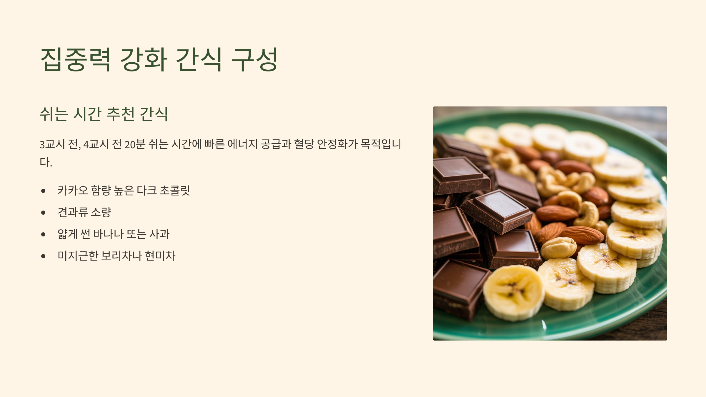 - 집중력 강화 간식 구성: 쉬는 시간(3교시 전 20분, 4교시 전 20분)에 섭취할 간식은 빠르게 에너지를 공급하고 혈당을 안정화시키는 것이 목적입니다.