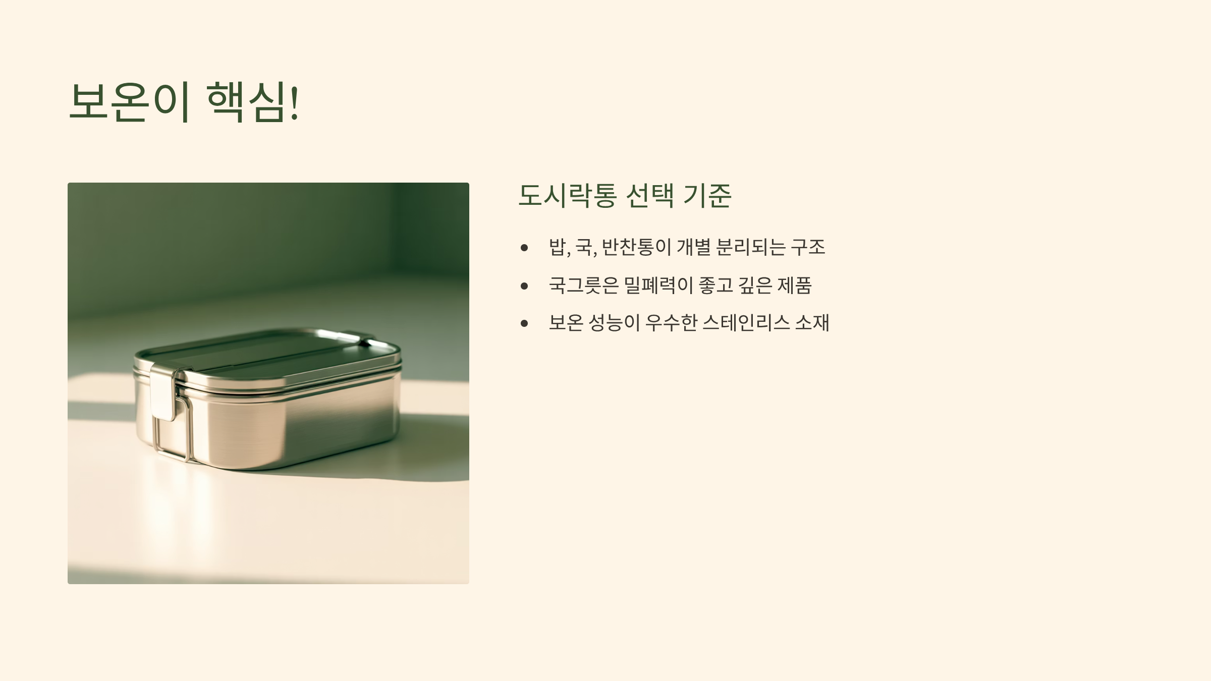 - 도시락통 선택 기준: 단순한 보온 기능뿐만 아니라, 밥, 국, 반찬통이 개별로 분리되는 구조를 선택해야 합니다. 밥과 국은 뜨겁게, 상대적으로 빨리 식어도 괜찮은 반찬은 분리하여 담는 것이 효율적입니다. 특히 국그릇이 밀폐력이 좋고 깊어 보온성이 높은 제품이 좋습니다.