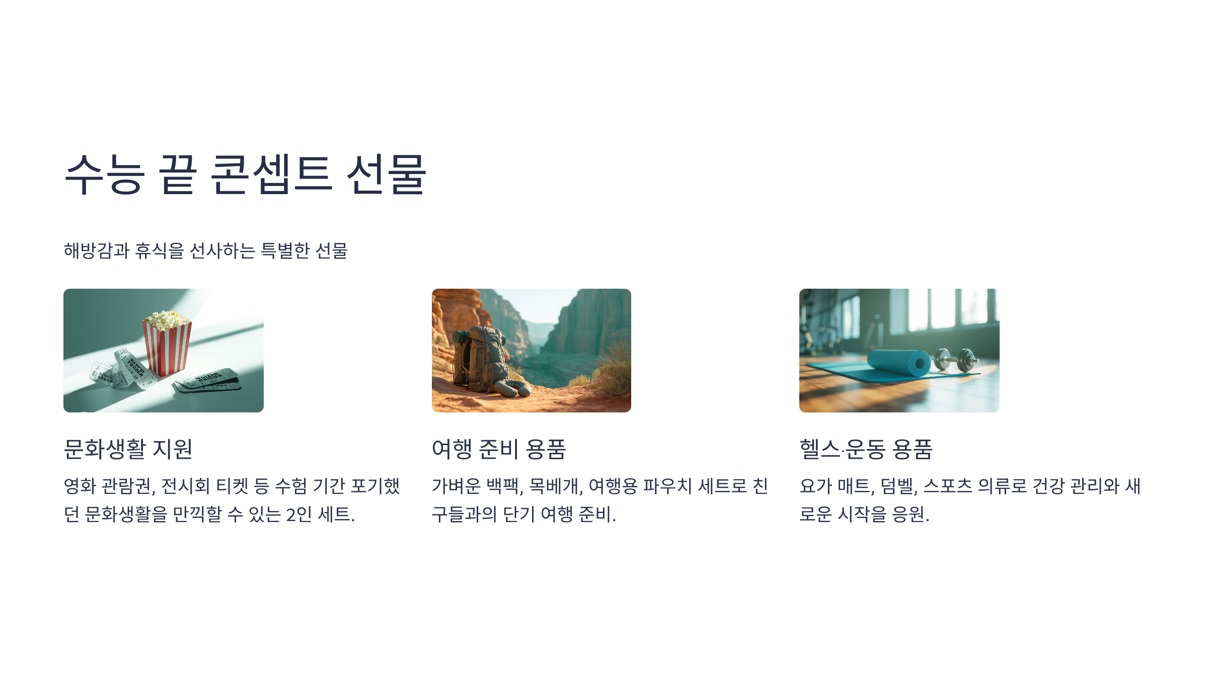 수능 직후는 수험생에게 '해방'과 '휴식'이 가장 필요한 시기입니다. 이 시기에 맞춰진 콘셉트 선물은 큰 기쁨을 선사합니다.
