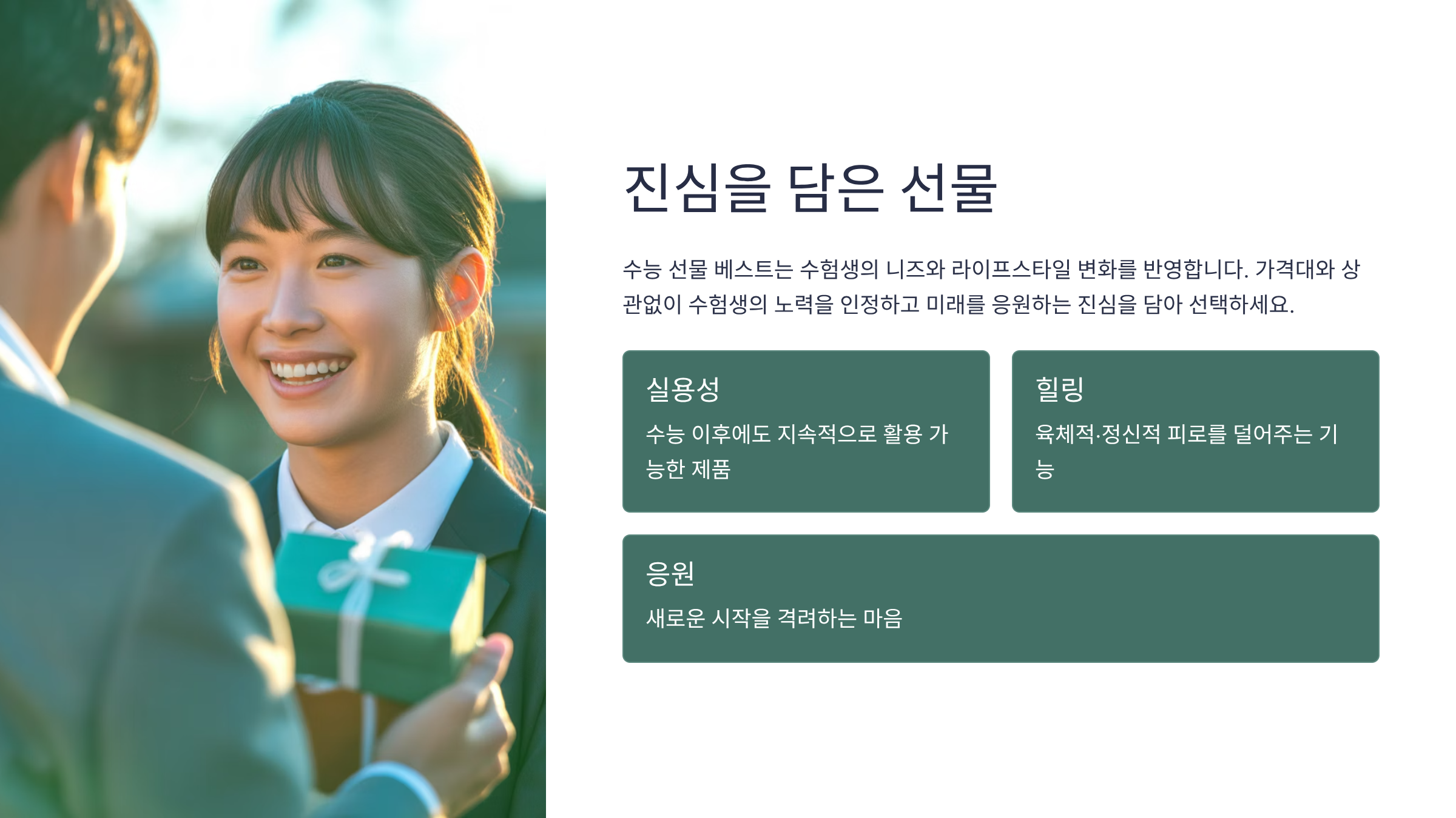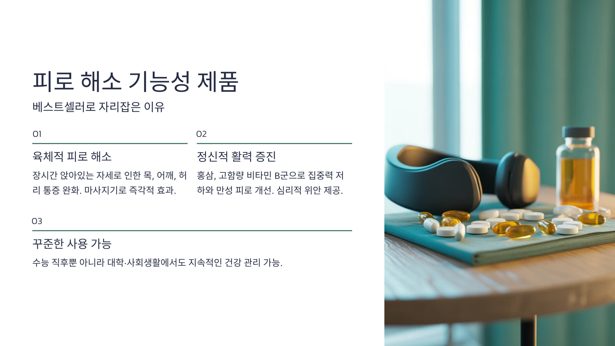 - 꾸준한 사용 가능: 기능성 제품은 수능 직후 일시적으로 끝나는 선물이 아니라, 대학 생활이나 사회생활을 하면서도 꾸준히 건강 관리에 활용할 수 있어 장기적인 실용성을 갖춘 베스트 선물로 평가받습니다.
