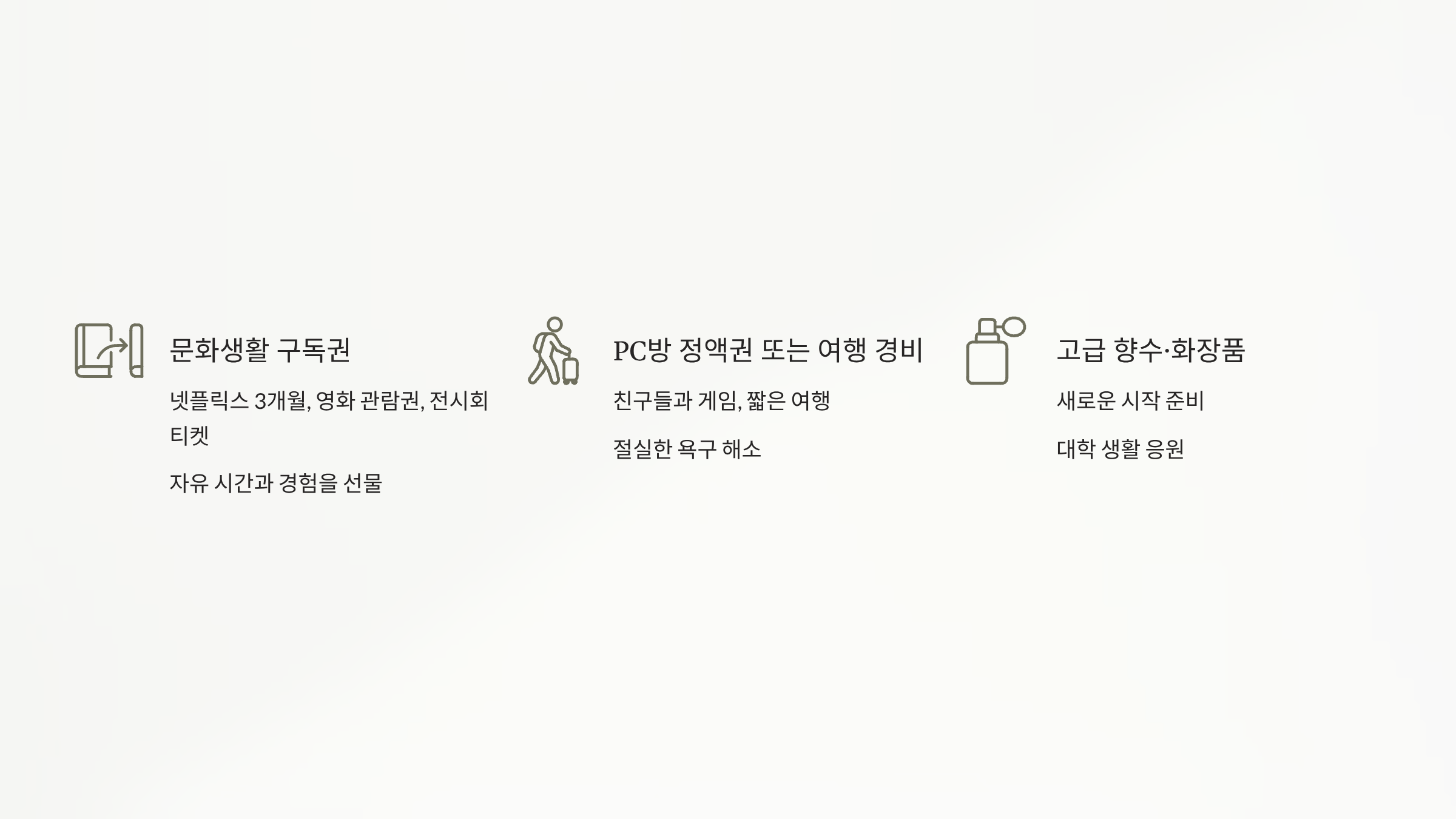 - 문화생활 구독권/이용권: 수험 기간 동안 포기했던 영화, 음악, 전시 등을 마음껏 즐길 수 있도록 넷플릭스 3개월 구독권, 영화 관람권 세트, 관심 분야 전시회 티켓 등을 선물합니다. 이는 단순한 물건이 아닌 '자유 시간'과 '경험'을 선물하는 것입니다.