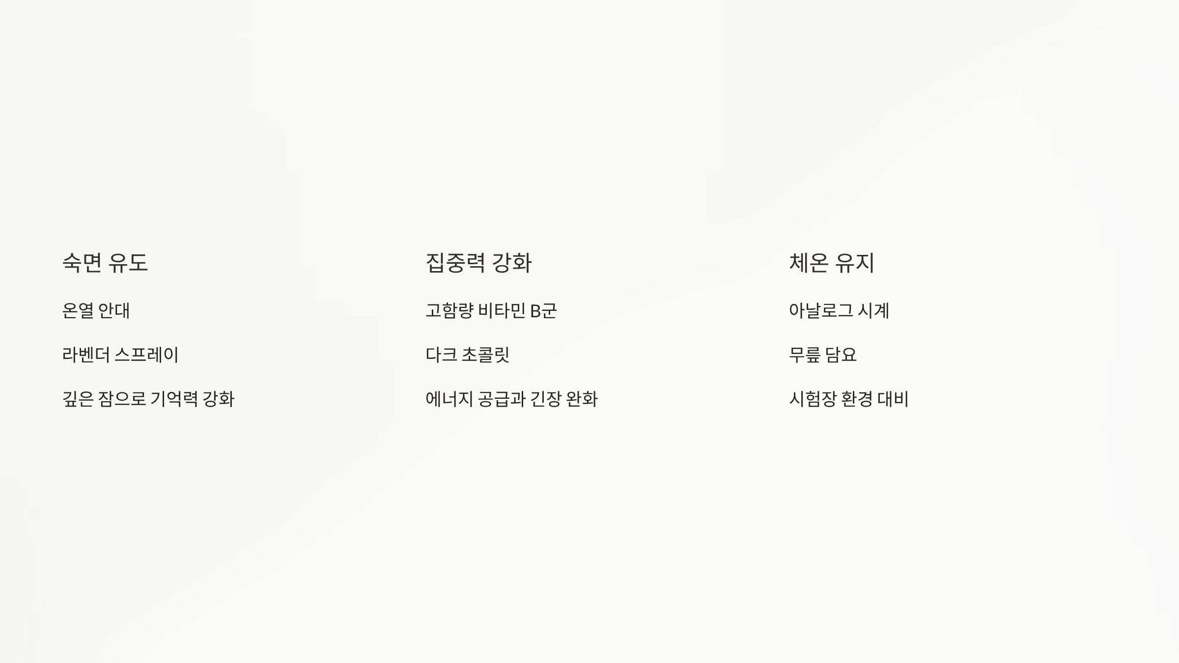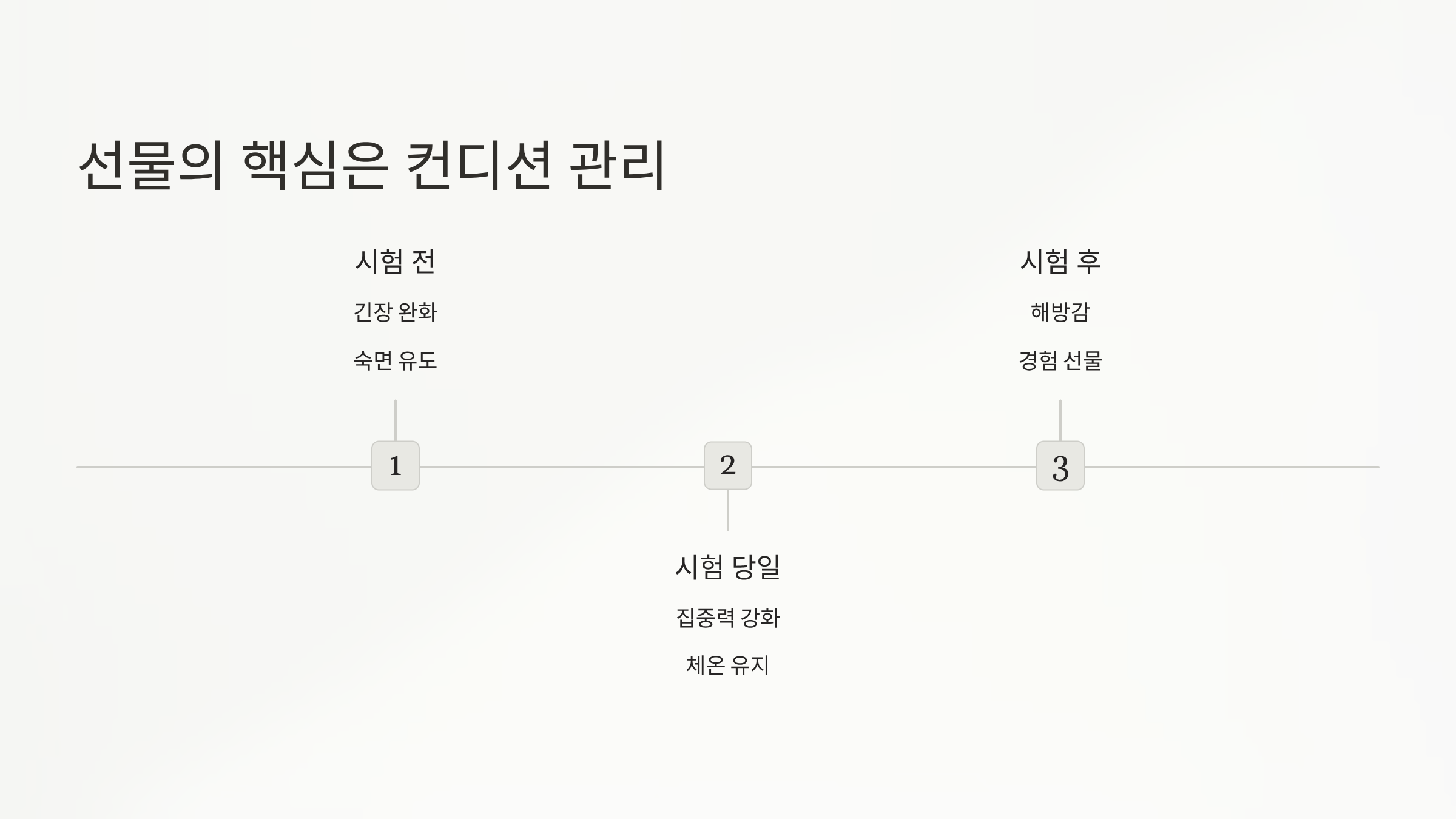 수능 직전에는 새로운 지식을 넣기보다, 이미 학습한 실력을 시험 당일까지 완벽하게 '지키는 것'이 중요합니다. 이를 돕는 3가지 핵심 컨디션 관리 선물을 추천합니다.