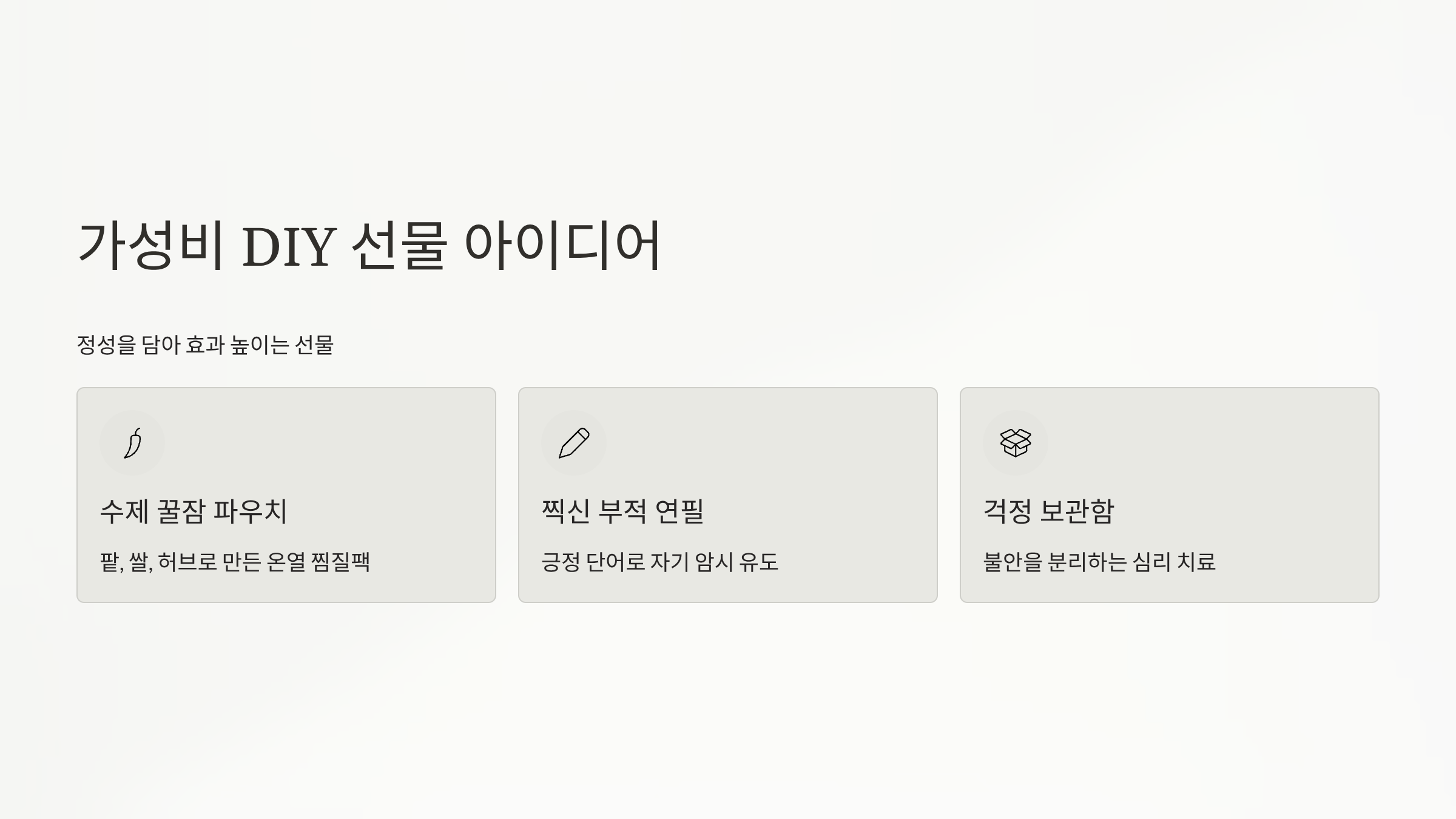 고가의 안마기나 IT 기기 대신, 정성과 마음을 담아 심리적 안정감을 높이고 실용성까지 갖춘 가성비 DIY 선물 아이디어입니다.