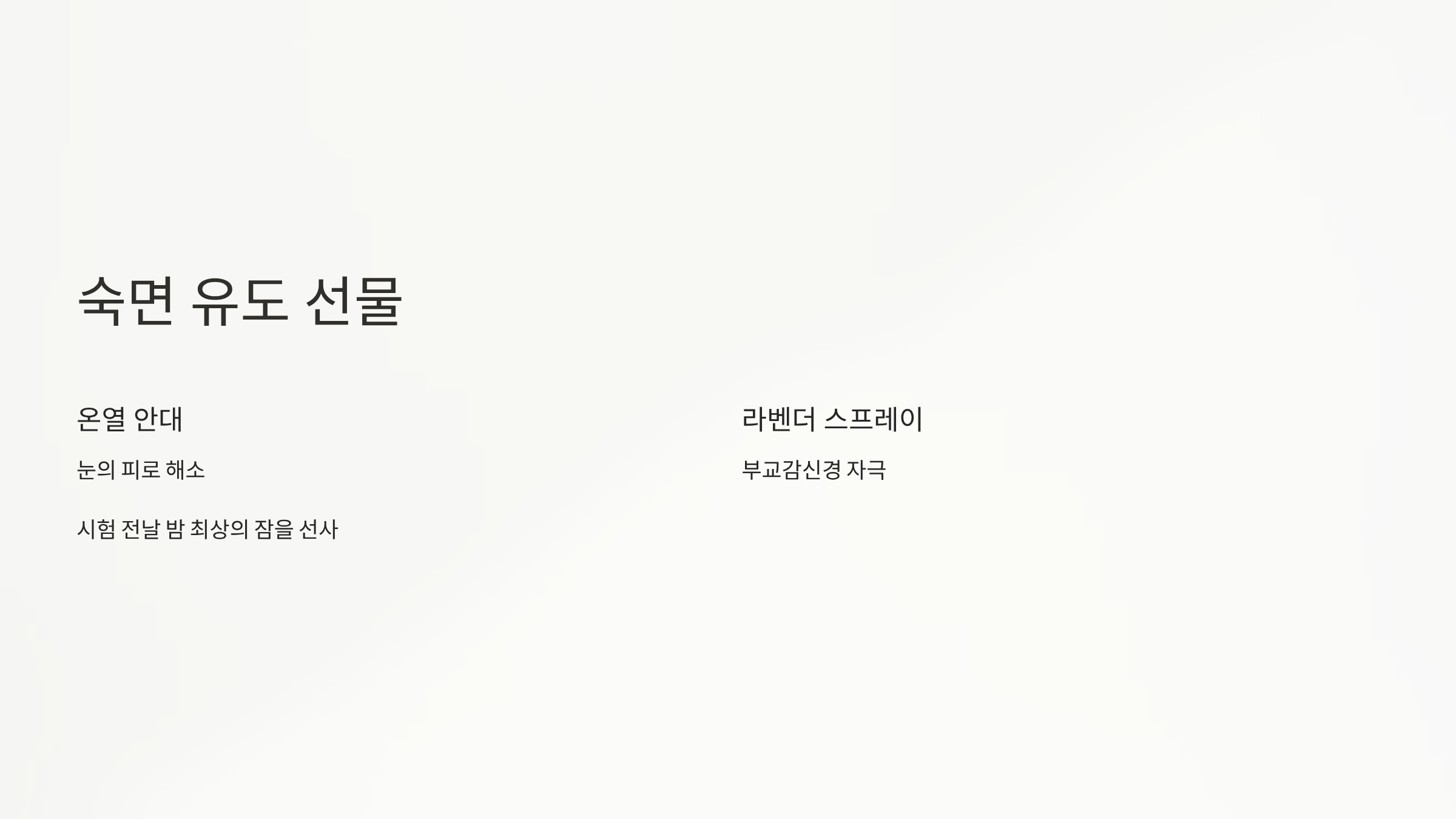 - 숙면 유도 선물 (온열 안대 & 라벤더 스프레이): 숙면은 기억의 장기 저장을 돕는 핵심입니다. 온열 안대는 눈의 피로를 풀어주고, 라벤더 향은 부교감신경을 자극하여 깊은 잠을 유도합니다. 두 가지 모두 시험 전날 밤 수험생에게 최상의 잠을 선사하는 데 결정적인 역할을 합니다.