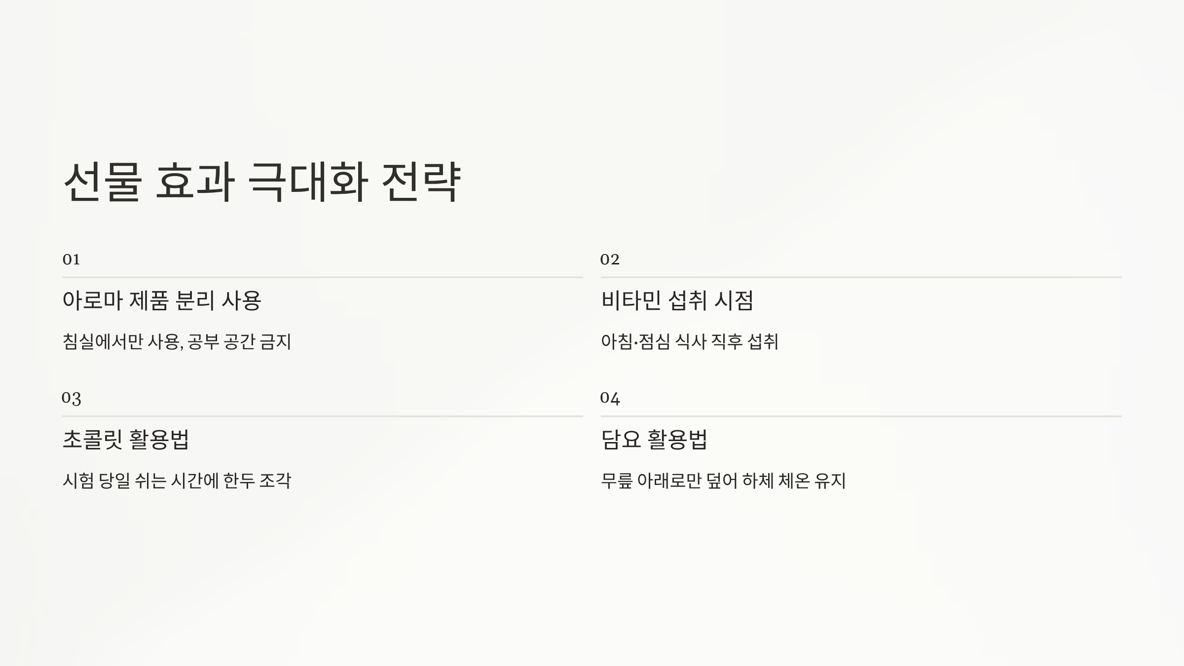 수험생에게 가장 필요한 것은 긴장 완화와 숙면을 돕는 온열 안대, 아로마 제품, 비타민 등 실력 유지에 초점 맞춘 선물입니다. 선물의 효과를 극대화하기 위해 아로마 제품의 사용 공간을 분리하고, 비타민 섭취 시점을 조절하는 실용적인 팁을 활용하십시오. 고가 제품 대신 가성비 좋은 DIY 힐링 선물과 함께, 시험 이후의 '진짜 자유'를 응원하는 이색 경험 선물까지 전달하여, 수험생이 마지막까지 최고의 컨디션으로 시험을 마칠 수 있도록 따뜻하게 지원하시기를 바랍니다.