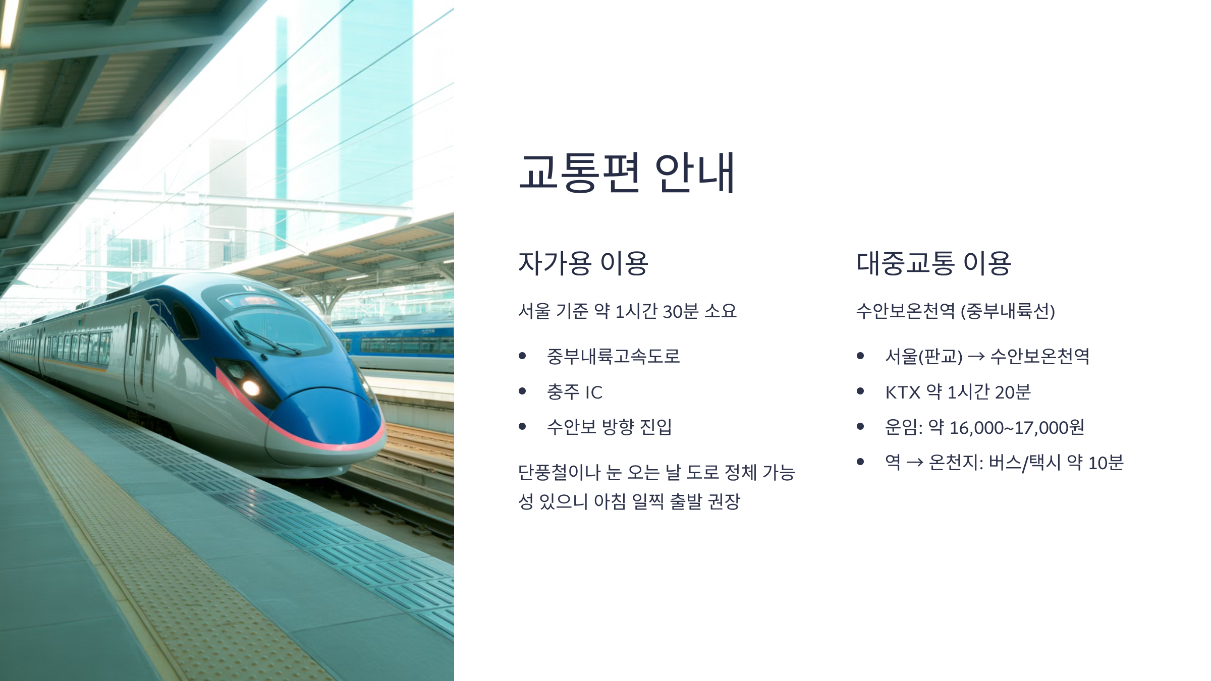 - 서울(판교 기준) → 수안보온천역 : KTX 약 1시간 20분 소요