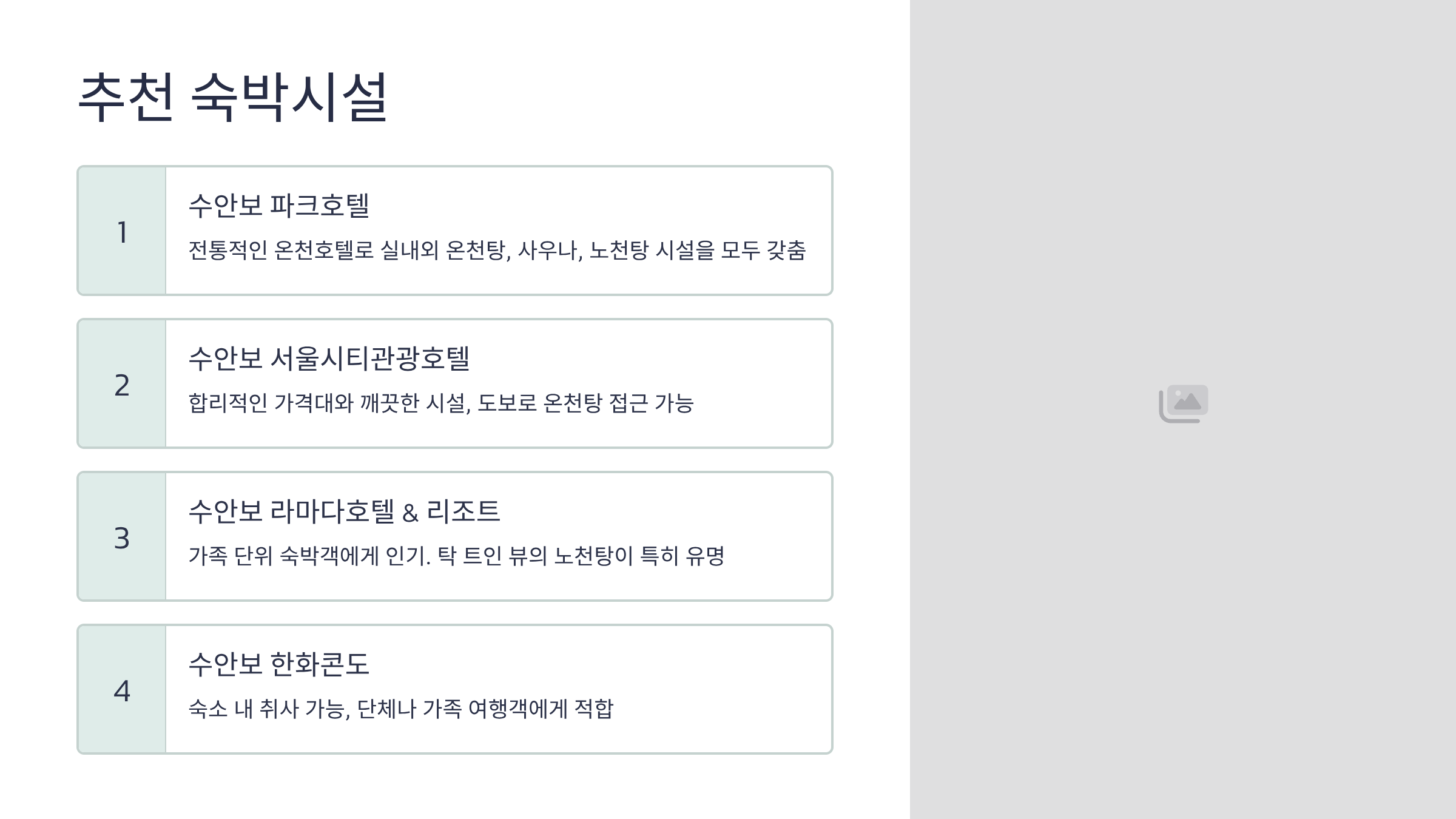- 수안보 서울시티관광호텔 : 합리적인 가격대와 깨끗한 시설, 도보로 온천탕 접근 가능.