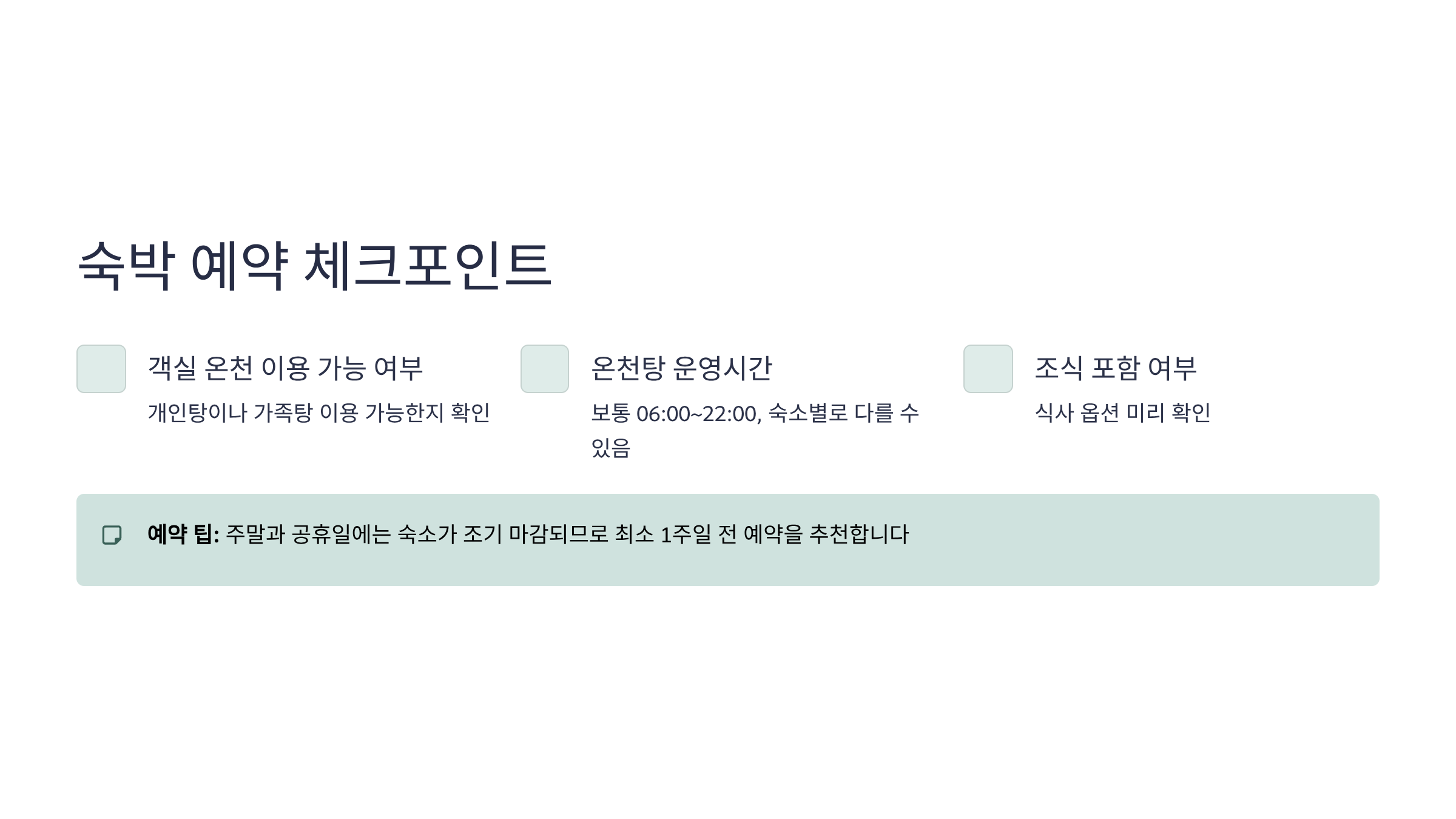 숙소 예약 시 유의할 점은 객실 온천 이용 가능 여부, 온천탕 운영시간, 조식 포함 여부 등을 미리 확인하는 것이다.