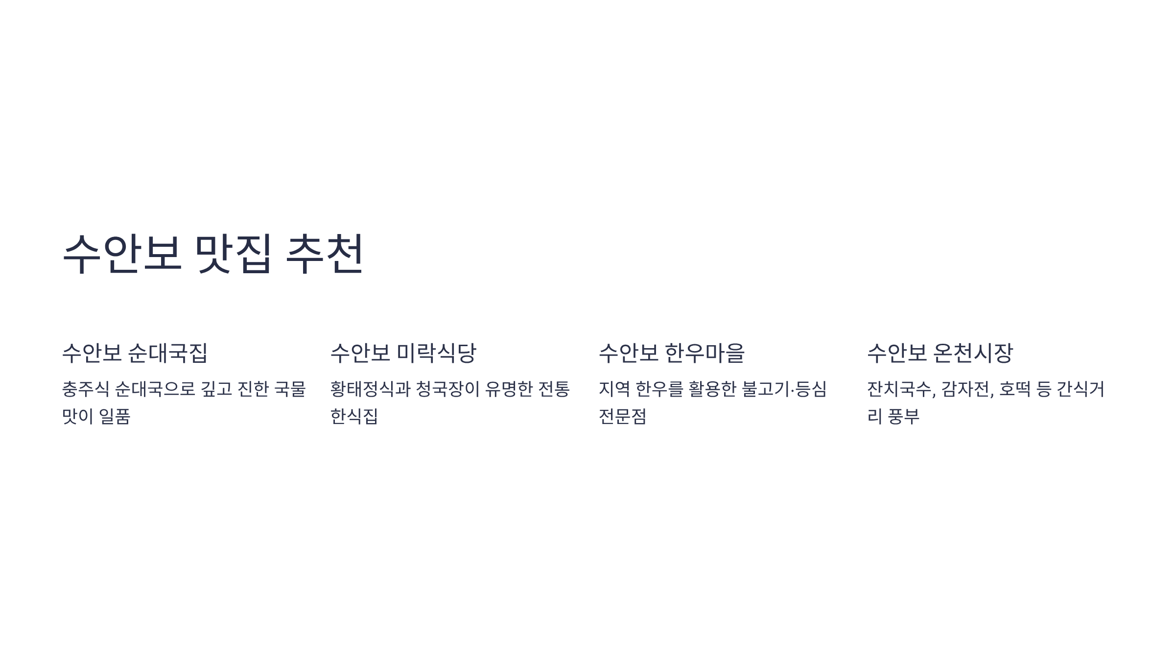 - 수안보 순대국집 : 충주식 순대국으로, 깊고 진한 국물맛이 일품.