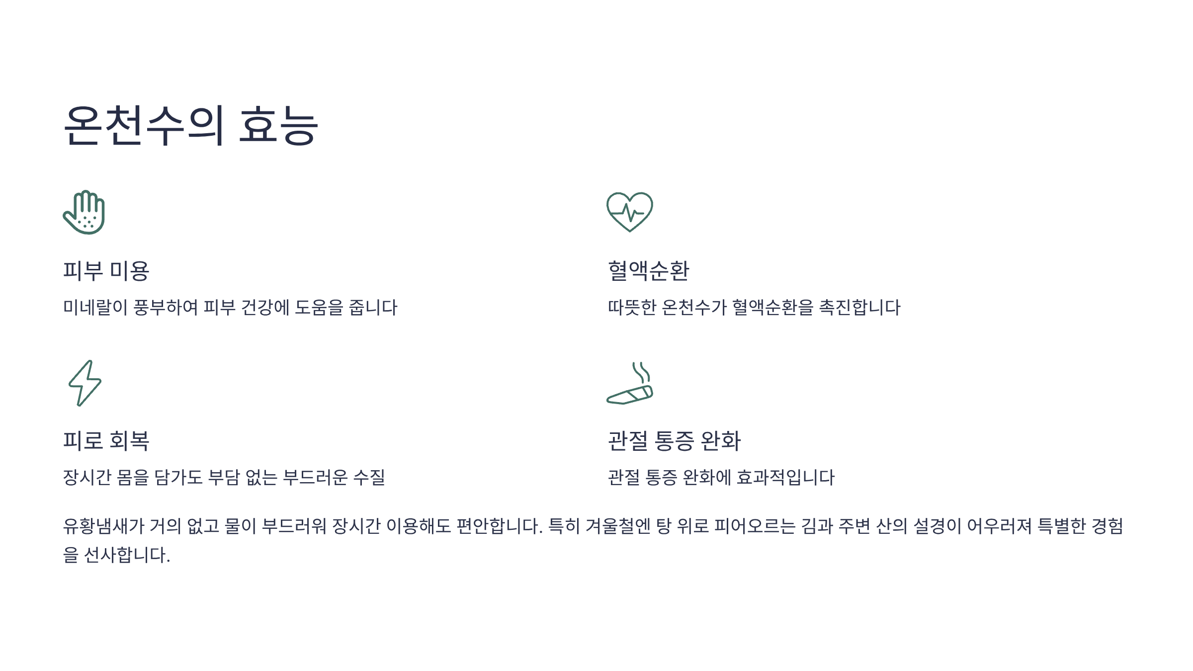 온천탕에 들어서면 유황냄새가 거의 없고, 물이 부드러워 장시간 몸을 담가도 부담이 적다.