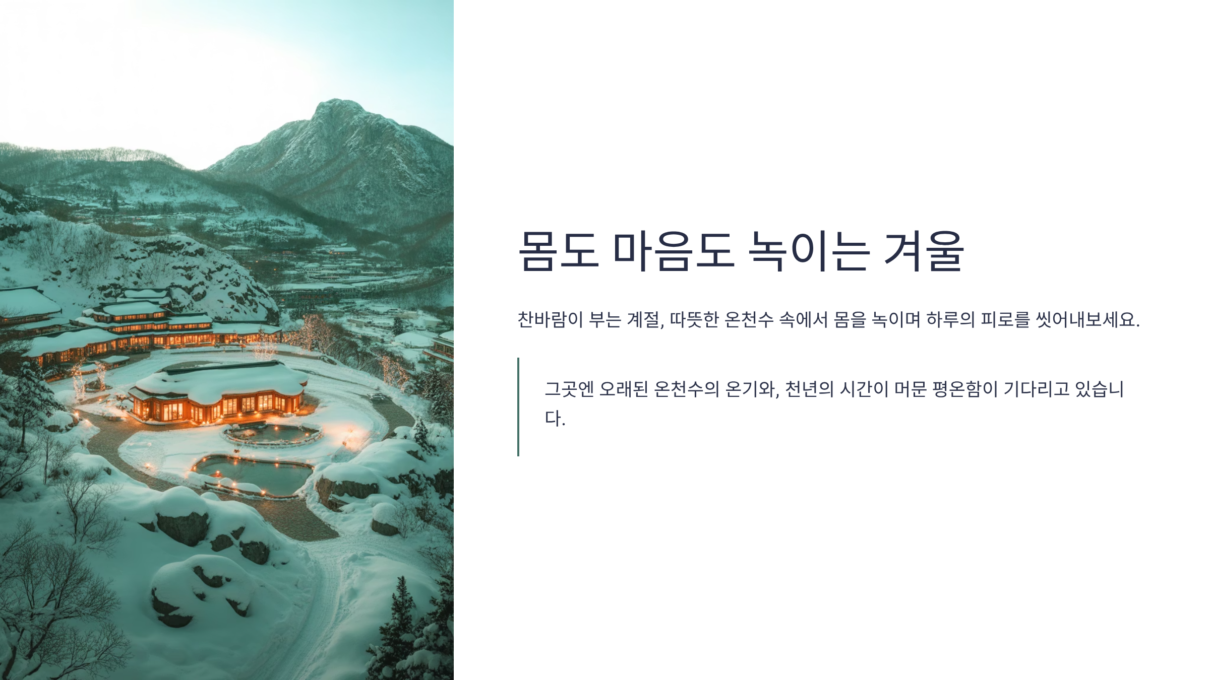 특히 겨울철엔 탕 위로 피어오르는 김과 주변 산의 설경이 어우러져, ‘몸과 마음이 동시에 치유되는 여행지’로 손꼽힌다.