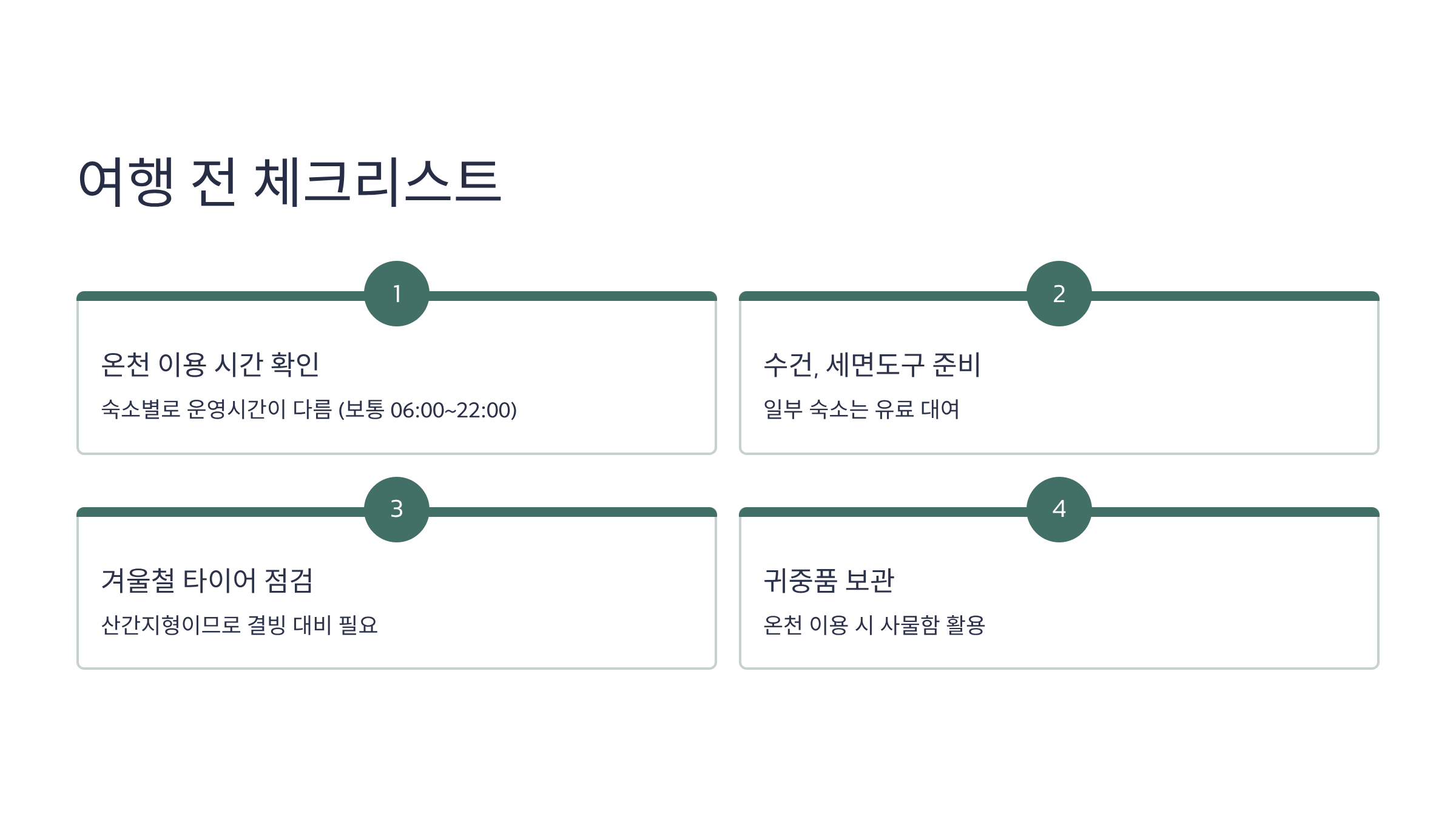 - 온천 이용 시간 확인 : 숙소별로 운영시간 다름 (보통 06:00~22:00)