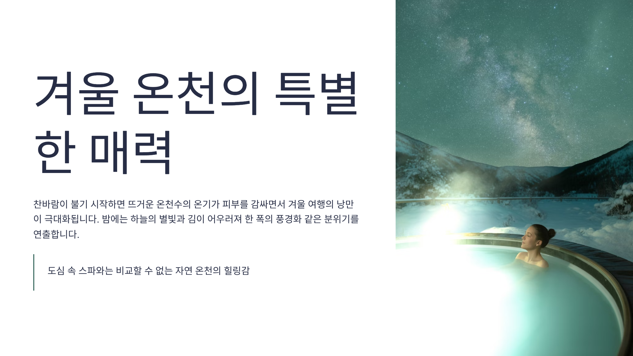 찬바람이 부는 계절, 따뜻한 온천수 속에서 몸을 녹이며 하루의 피로를 씻어내보자.