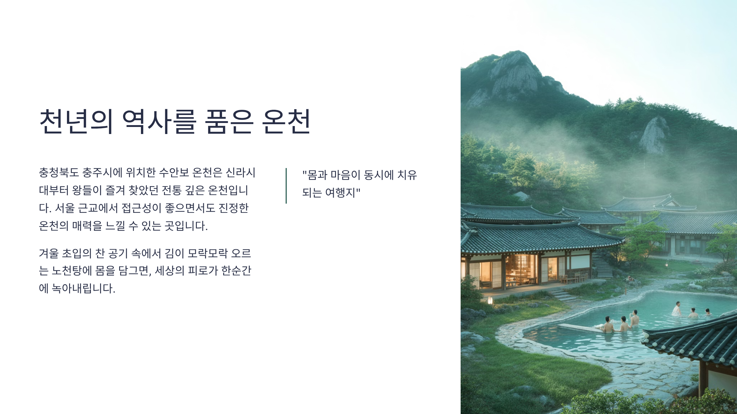 그곳엔 오래된 온천수의 온기와, 천년의 시간이 머문 평온함이 기다리고 있다.