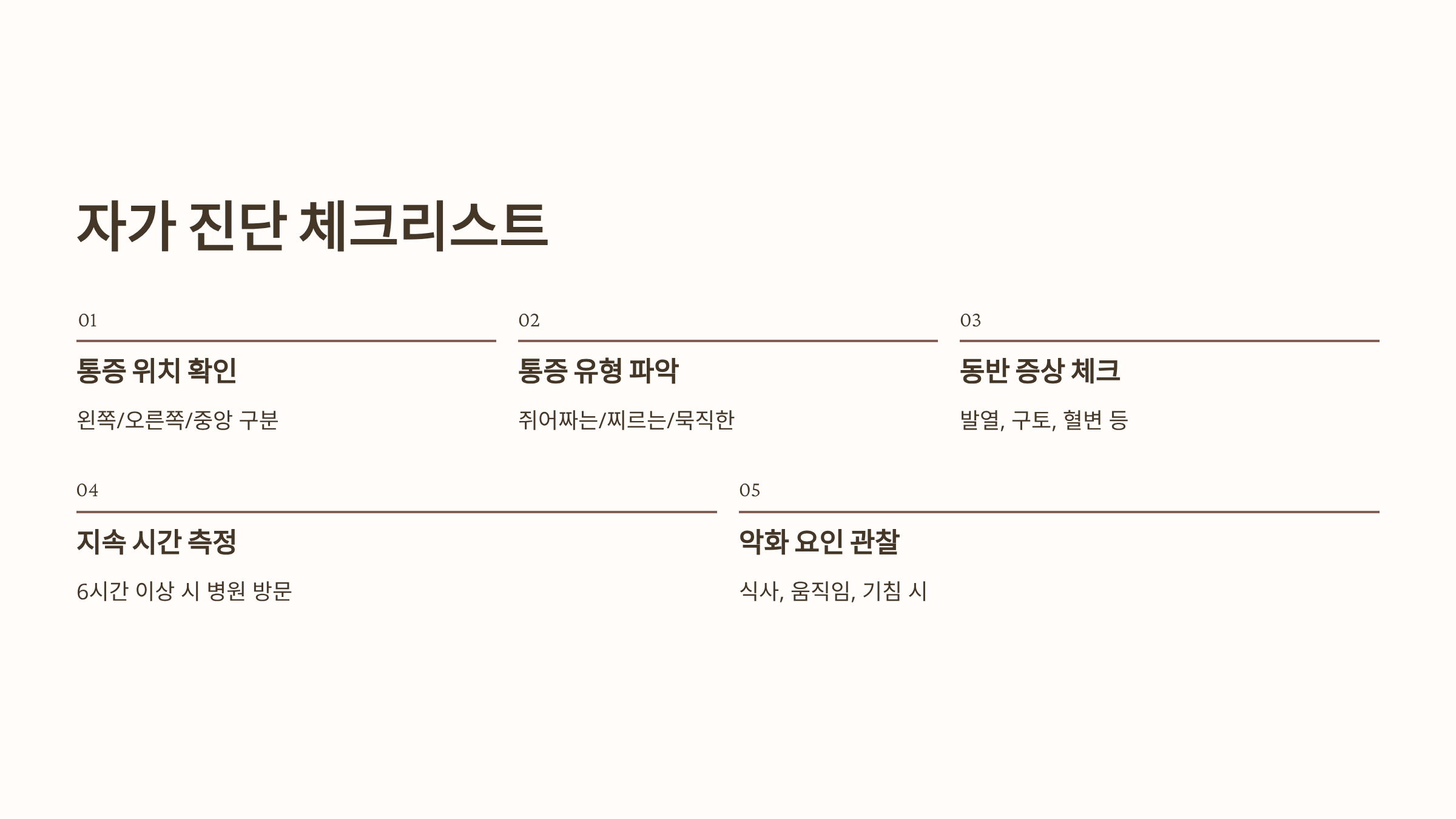 자가 진단 핵심: 통증이 시작된 위치를 손가락으로 짚어보고, 통증이 시간이 지나면서 다른 부위로 이동하거나 확산되는지 주의 깊게 관찰해야 합니다.