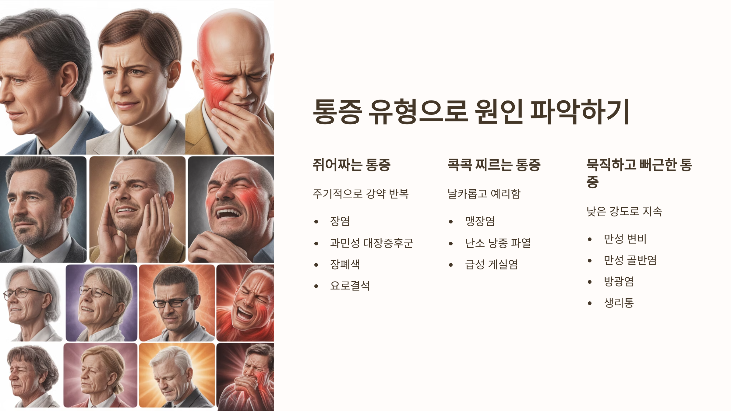 흔한 소화기 문제부터 맹장염, 요로결석, 여성 생식기 문제 등 응급 질환까지 원인을 분석합니다. 통증의 유형(쥐어짜는, 콕콕 찌르는)이 의미하는 질환 정보를 정리하고, 통증 발생 시 즉시 병원을 찾아야 할 위험 신호까지 안내합니다.